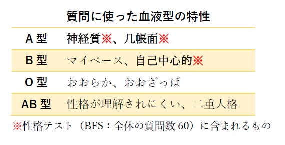 過去の相互に矛盾する性格テストの結果については、血液型に比べると年齢や性別の差が大きいため、これらの「ばらつき」により起きたものと考えられます。また、個人差により性格の感じ方「性格感度」が異なるため、性格テストの数値が同じでも、必ずしも性格そのものが一致しない場合があることも明らかになりました。