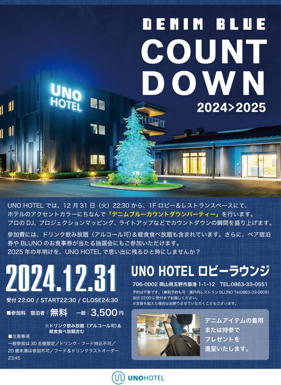 2024年12月31日(火)、UNO HOTELでは音楽とビジュアル体験が一体となったデニムブルーカウントダウンパーティーが開催されます。DJによるエネルギッシュなパフォーマンスと、プロジェクションマッピングで会場全体を彩りながら、訪れる全員に忘れられない新年の瞬間をお届けします。