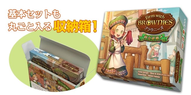 ゲームマーケット2021秋で先行販売!大人気ボードゲーム「ファーム・ウィズ・ブラウニーズ」の拡張セット【商会研修!】がやのまんから新発売!一歩上の経営力を鍛える1人用ゲームルールが追加されます!