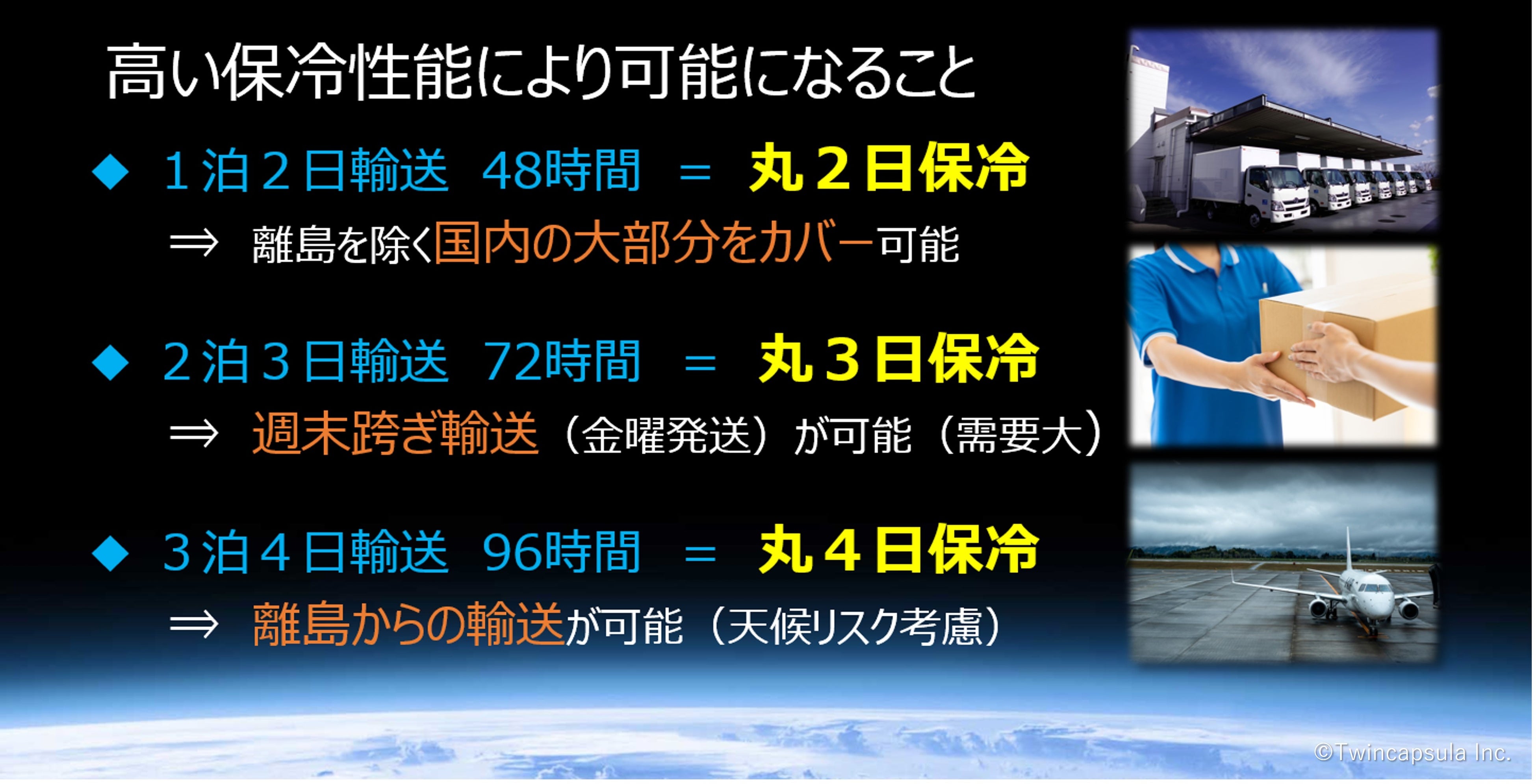 丸2日の保冷ができれば、離島を除く国内全体をカバーでき、丸3日であれば、週末跨ぎ輸送(金曜発送、月曜受け取り)が可能に、さらに、丸4日であれば、天候不良等での欠航リスクを考慮しても離島もカバーすることが可能となります。今回開発した断熱保冷容器は、これらを可能にするものです。