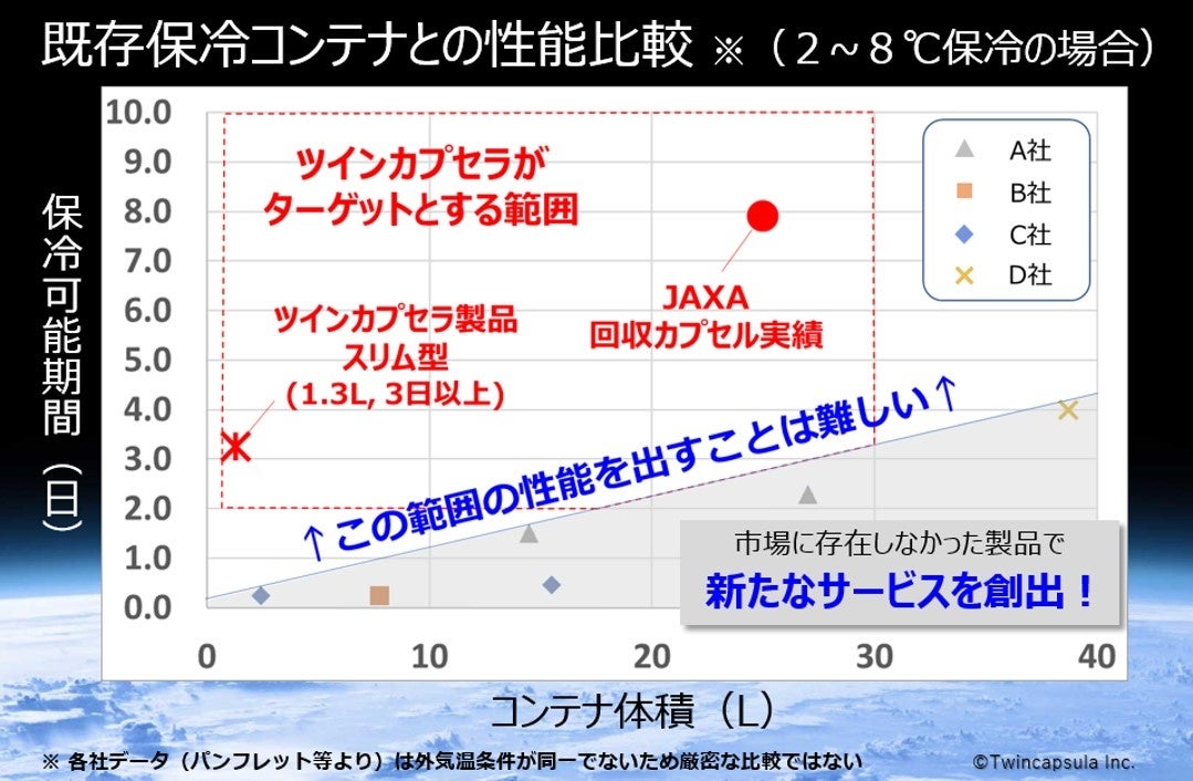 ツインカプセラは、2022年12月にタイガー魔法瓶(株)との間で締結したスリム型断熱保冷容器の開発に関する業務提携により、バイオメディカル分野における検体等の保冷輸送を主なターゲットとした小型で超高性能な断熱保冷容器の開発を進めてきました(※)。