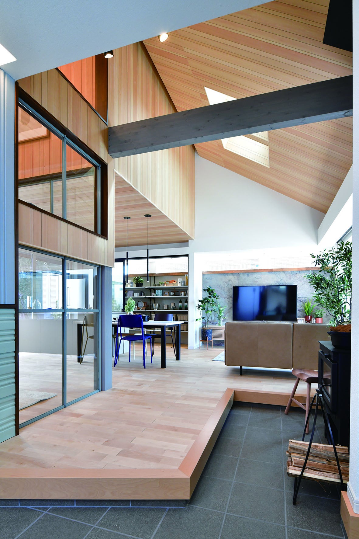 家族の気配を常に感じながらも、個々のプライベートを確保するためにスキップフロアで緩やかに空間を区切る間取りをご提案します。家事や勉強、テレワークなど、ライフスタイルに合わせてどんな用途にも活用できる上に、平屋の住まいで悩みがちな収納の問題も縦に広がる空間を活かして解決した、スタイリッシュな空間になります。