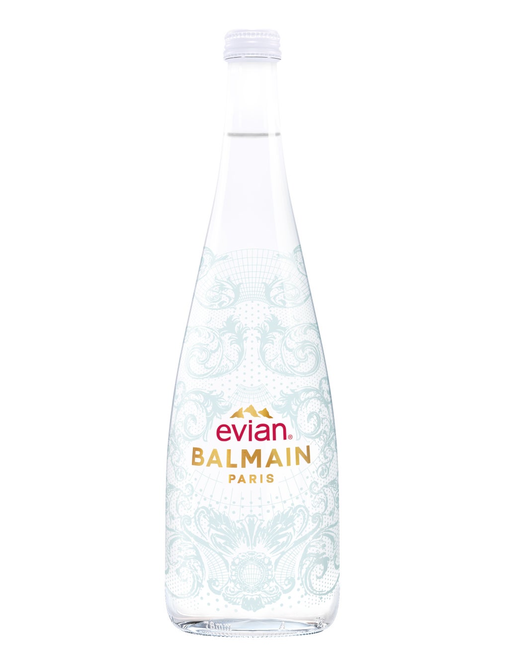 今回のデザインボトルの美しいデザインは、両者の世界観を融合させており、水色の繊細なレースと、エビアンのピュアなナチュラルミネラルウォーターからインスピレーションを得た水色のしずくが、バルマンの特徴である装飾とゴールドの文字でさらに強調されています。