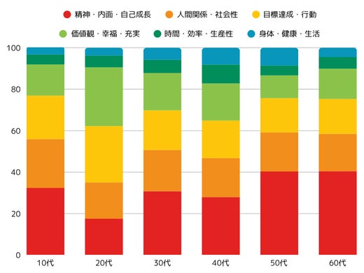 調査では、多くの年代で「精神・内面・自己成長」が上位に入り、特に20代は「価値観・幸福・充実」や「目標達成・行動」も上位に。年齢やライフステージに関係なく、内面と向き合い成長したいという普遍的な欲求を持っていることが示されています。