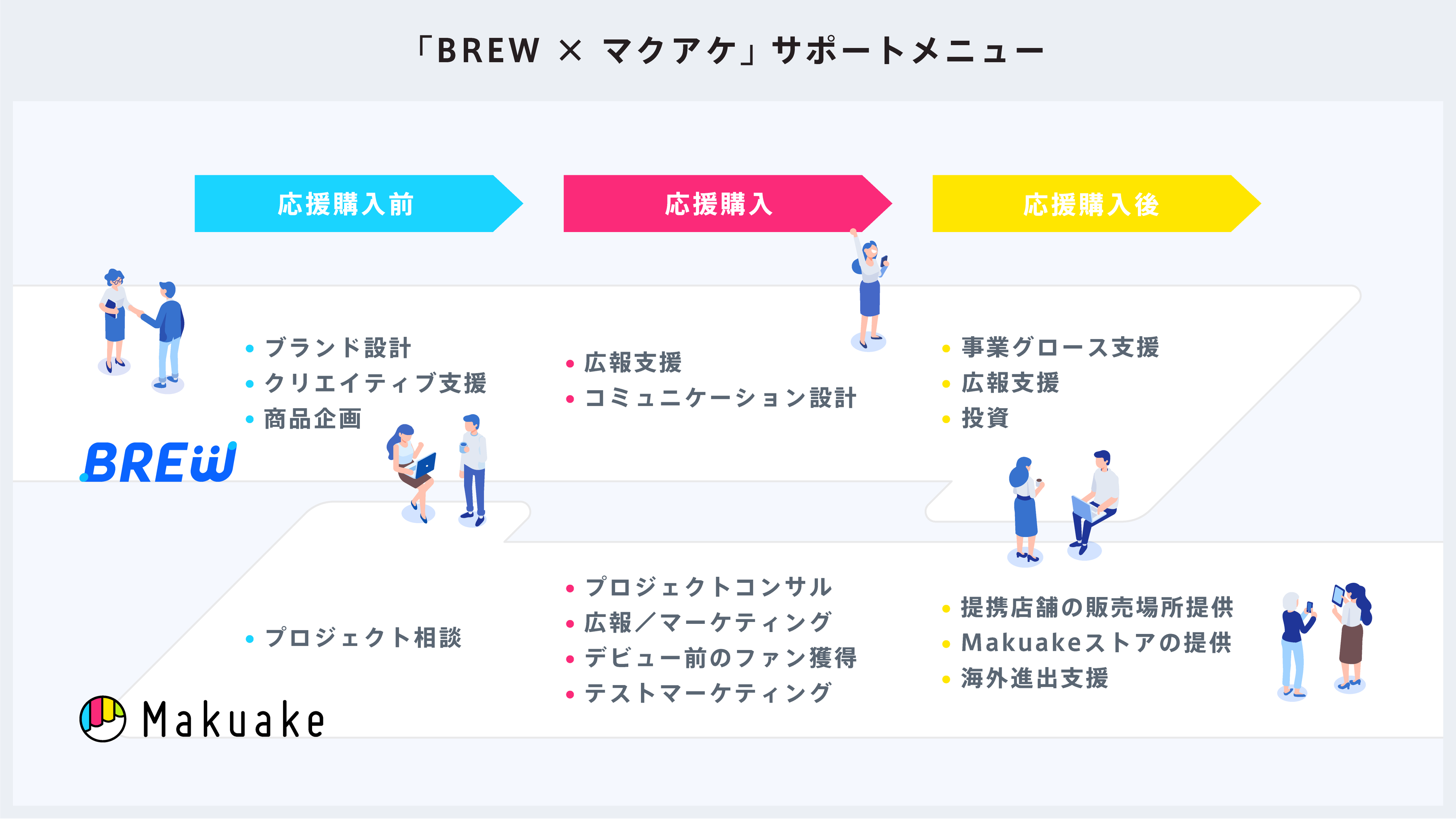 本提携により、BREWが支援を行っているスタートアップ企業は、商品がデビューする前の商品企画やブランド設計をBREWよりサポートを受けつつ、新商品デビューの場として「Makuake」でプロジェクトを実施、両者でプロジェクトのサポートを行っていきます。