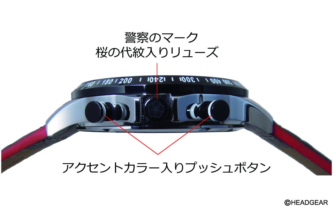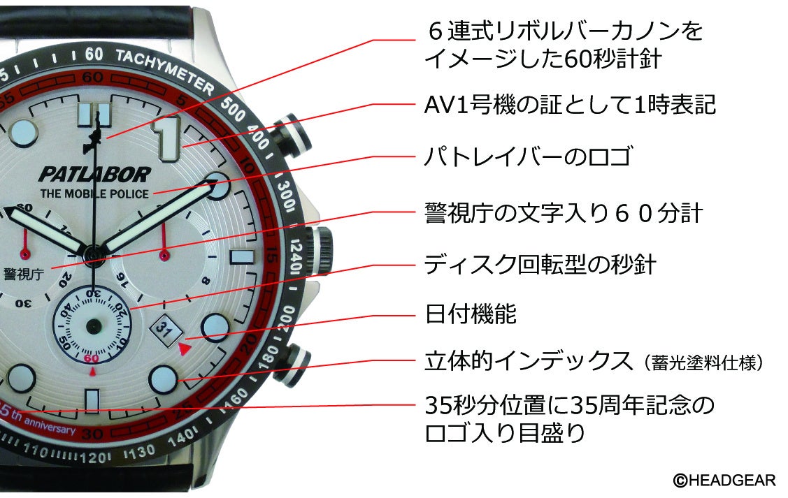 AV1号機の証として1時位置のみ「1」のビッグアラビアインデックスを採用し、6連式リボルバーカノンをイメージしたクロノグラフ60秒計針、警視庁の文字が入った60分計、警察のマーク桜の代紋入りリューズなど、35周年記念に相応しいデザインのスポーツタイプウォッチ。