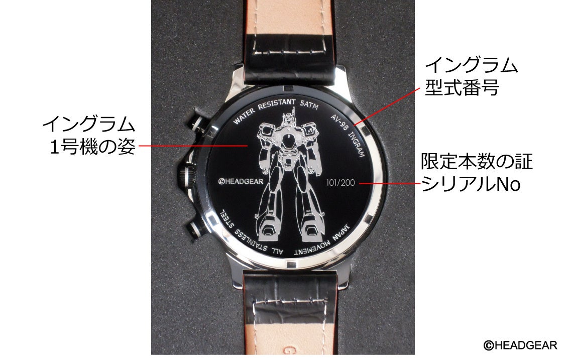 【再販100本限定販売】機動警察パトレイバー の35周年記念腕時計発売! イングラムをイメージしたデザインの腕時計。原作者HEADGEAR 5人の(複製)サイン入り取扱説明書付き。
