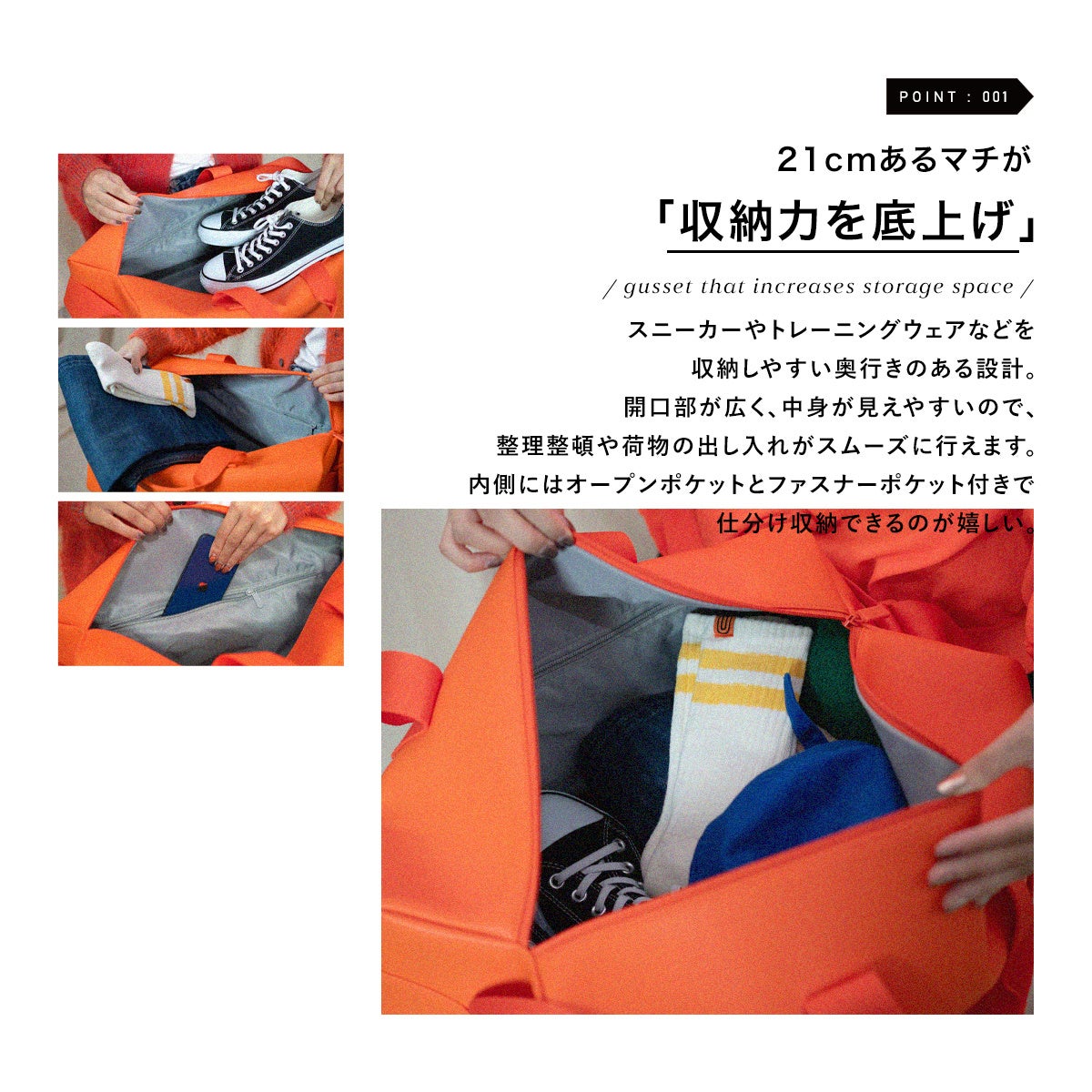 ボストンタイプ(Lサイズ)はスポーツバッグとして、スニーカーやトレーニングウェアなどの収納が可能。