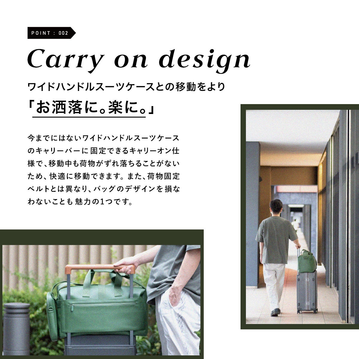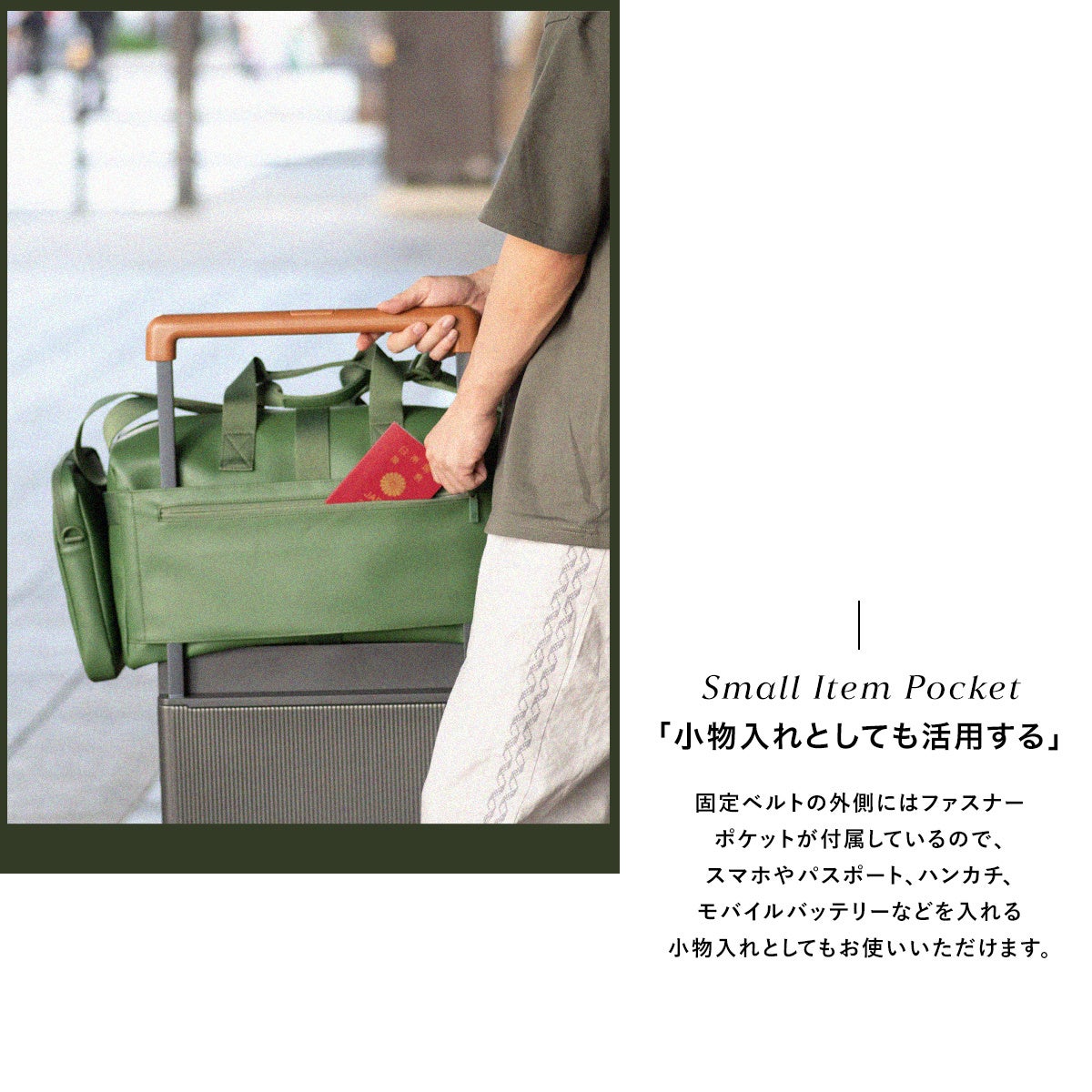 ボストンタイプ(Lサイズ)はワイドハンドルスーツケース(.OUNCE revelワイドハンドルシリーズ)に固定できるキャリーオン仕様。Sサイズ同様キャリーバーループの外側にはファスナーポケットが付属しているので、スマートフォンやパスポート、ハンカチ、モバイルバッテリーなどをいれる小物入れとしてもお使いいただけます。