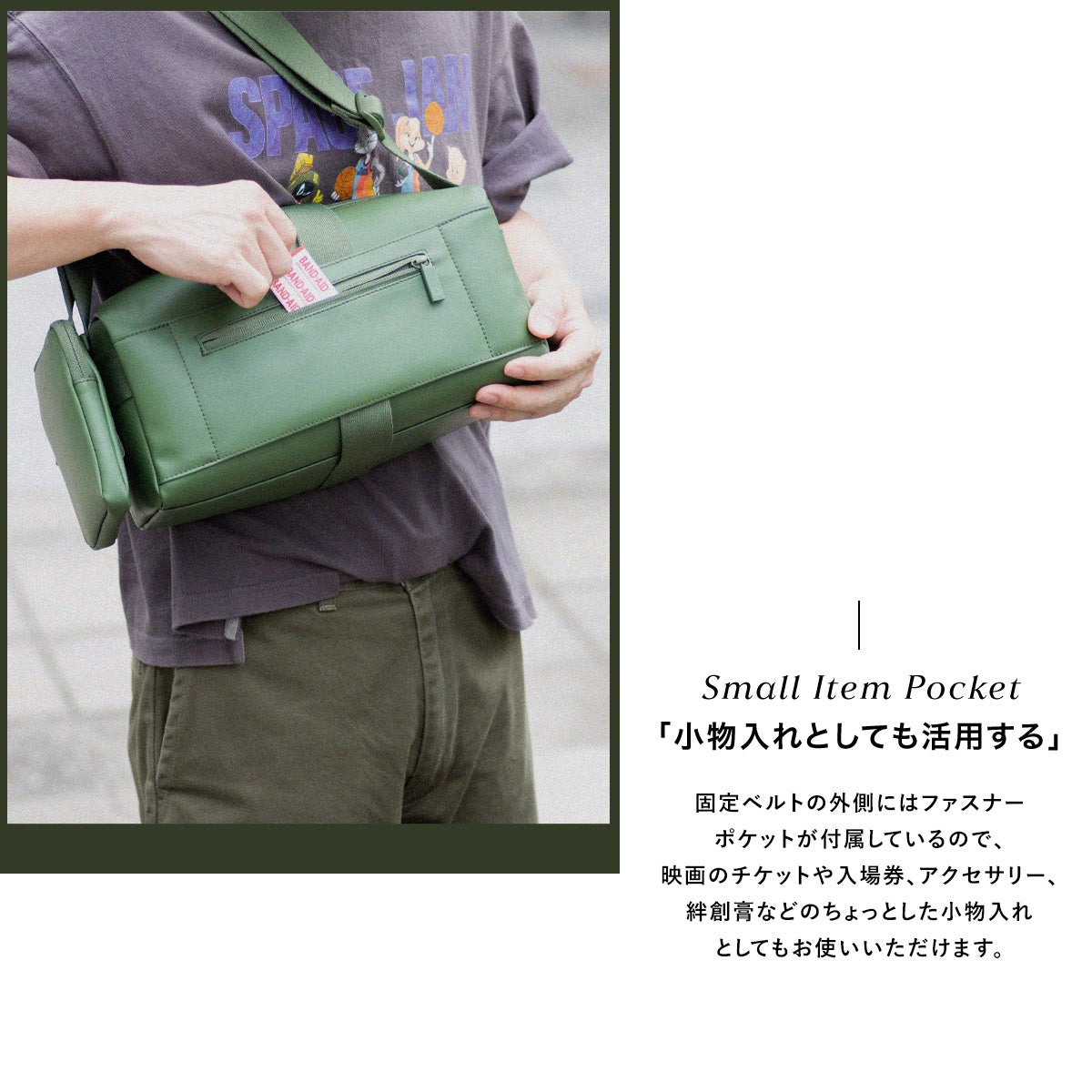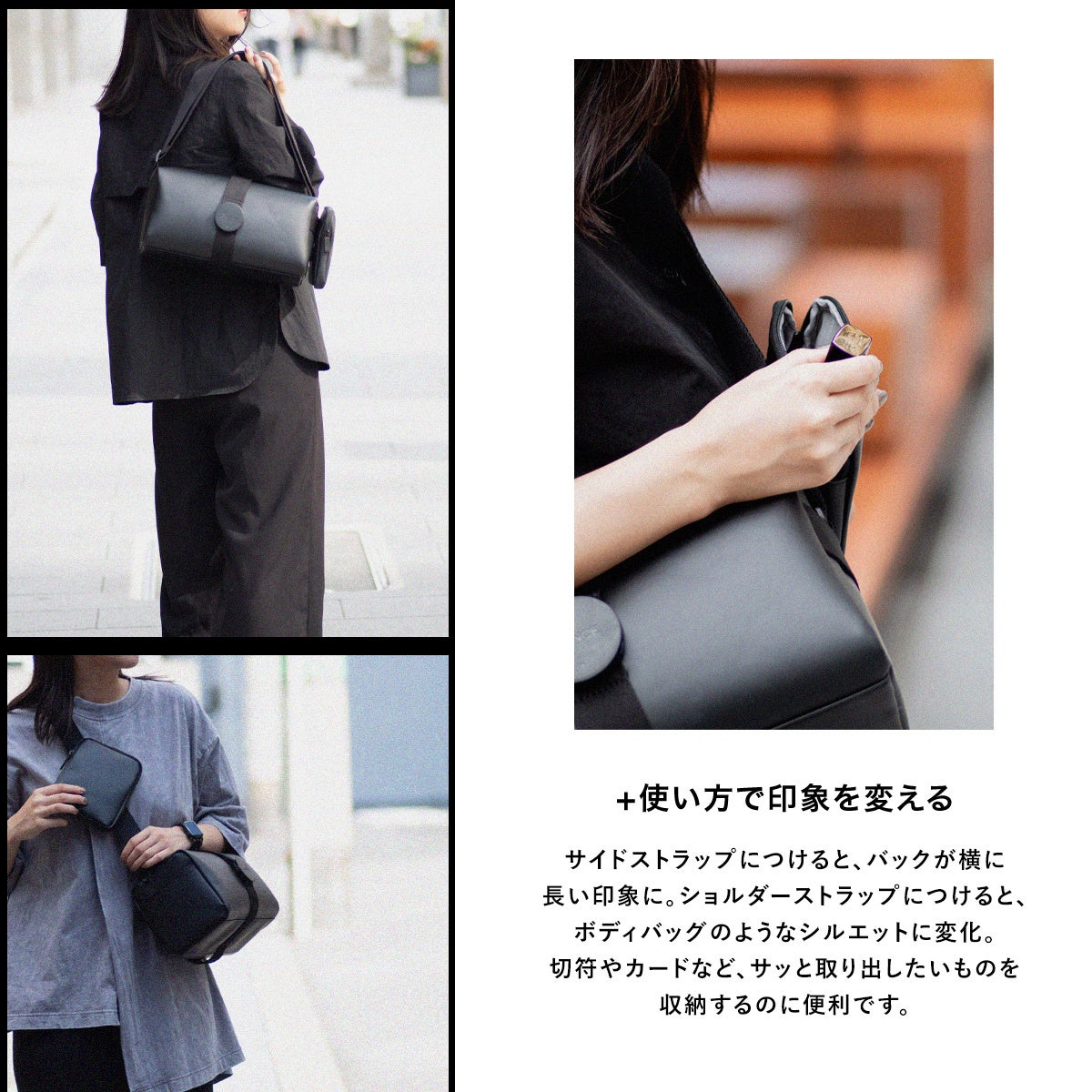 本体のサイドストラップにつけると、バッグが横に長い印象に。ショルダーストラップにつけると、ボディバッグのようなシルエットに変化。切符やカードなど、サッと取り出したいものを収納するのに便利です。
