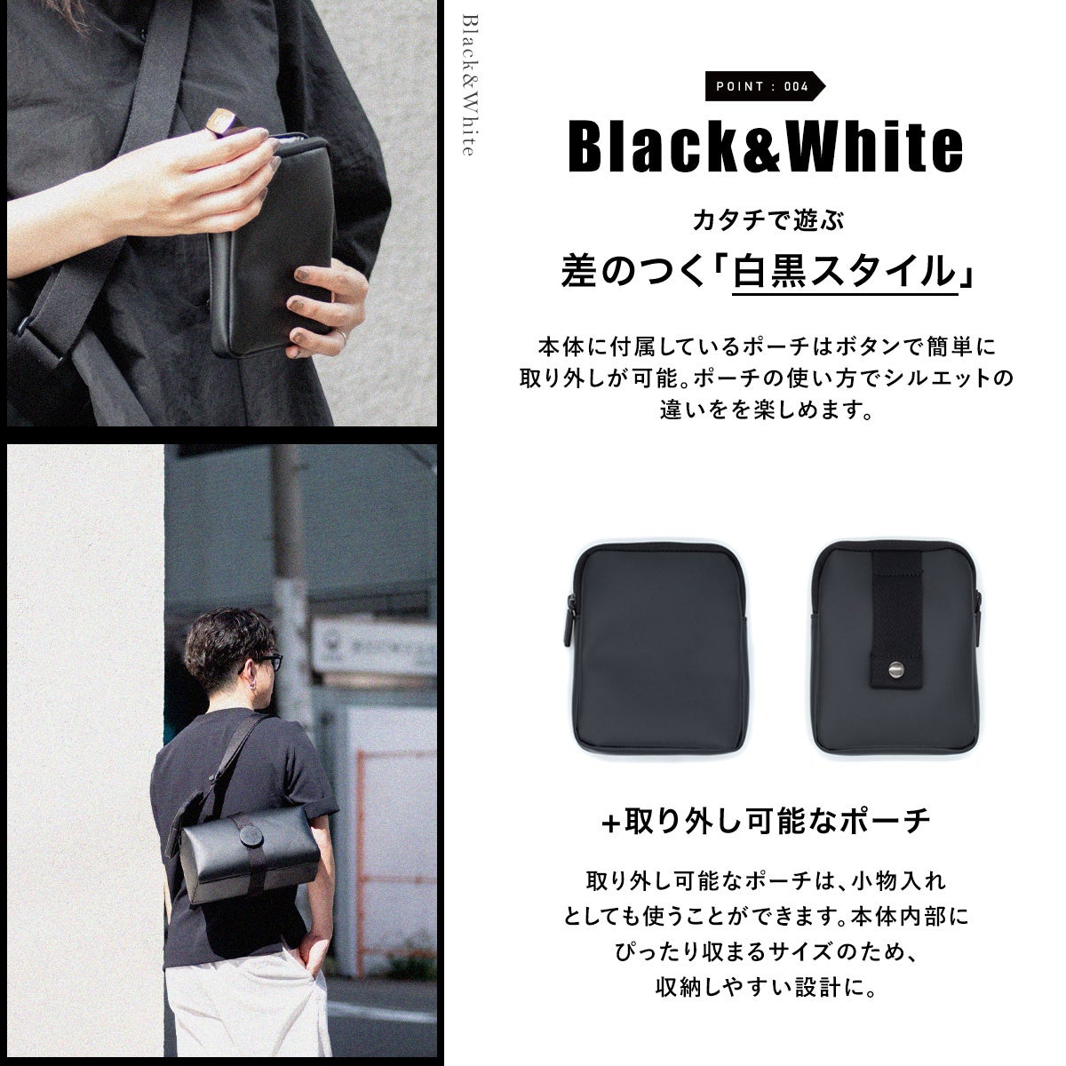 本体に付属しているポーチはボタンで簡単に取り外しが可能。ポーチの使い方でシルエットの違いを楽しめます。本体内部にぴったり収まるサイズに設計しているので、バッグに収納も可能。