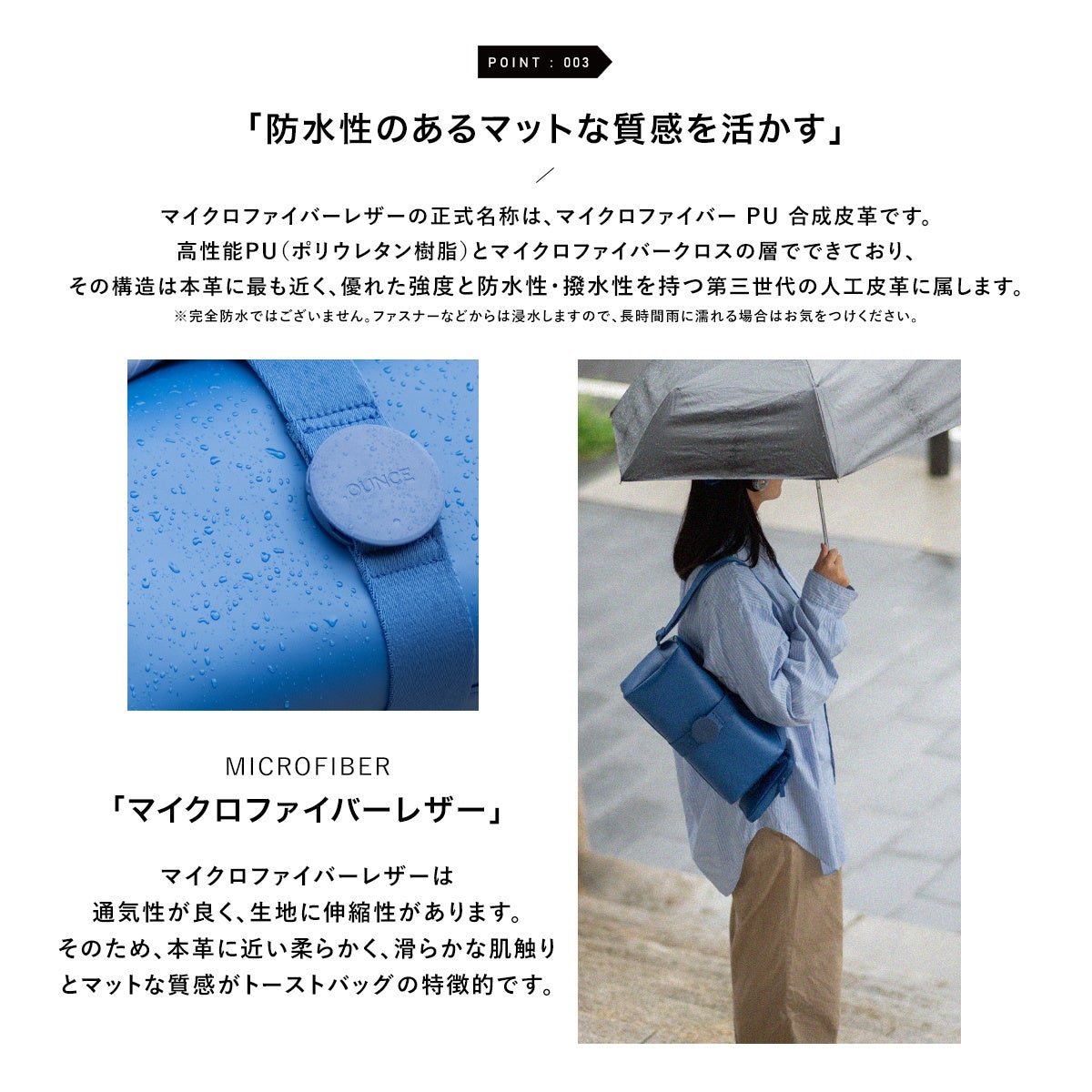 通気性が良く、生地に伸縮性があるマイクロファイバーPU合成皮革を使用。高性能PU(ポリウレタン樹脂)とマイクロファイバークロスの層でできており、その構造は本革に最も近く、優れた強度と防水性・撥水性を持つ第三世代の人口皮革に属します。本革に近い柔らかく、滑らかな肌触りとマットな質感がトーストバッグの特徴です。※完全防水ではございません。ファスナーなどからは浸水しますので、長時間雨に濡れる場合はお気をつけください。
