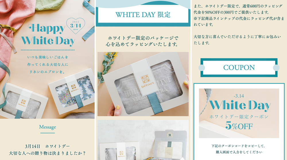 また、エプロン以外に、キッチンミトンやランチョンマットなどのキッチンリネンもホワイトデーキャンペーンの対象となっています。