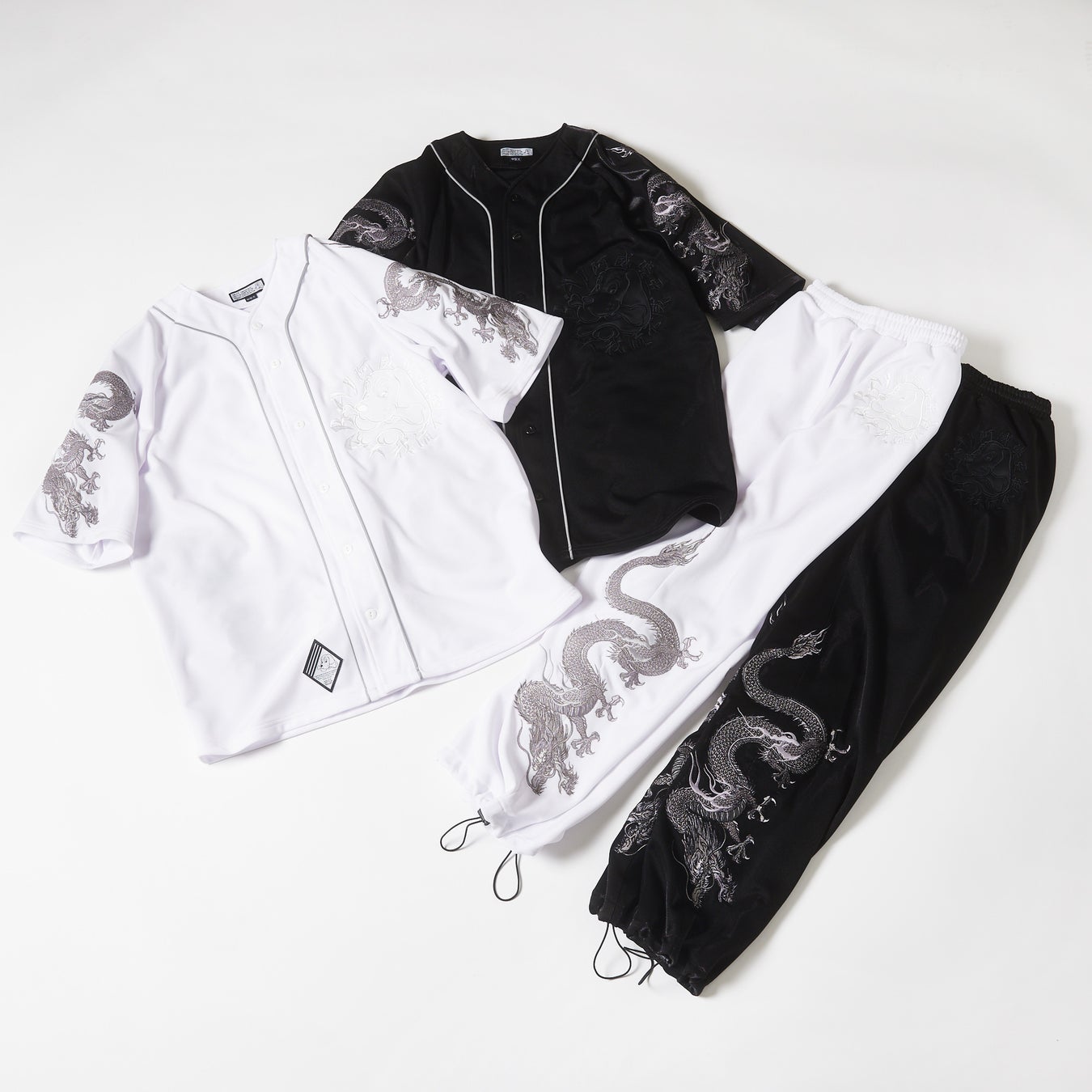 太もも下から裾に掛けてサイドに龍の刺繍を大きくデザインしたGALFY×AIVERコラボのジャージパンツ。