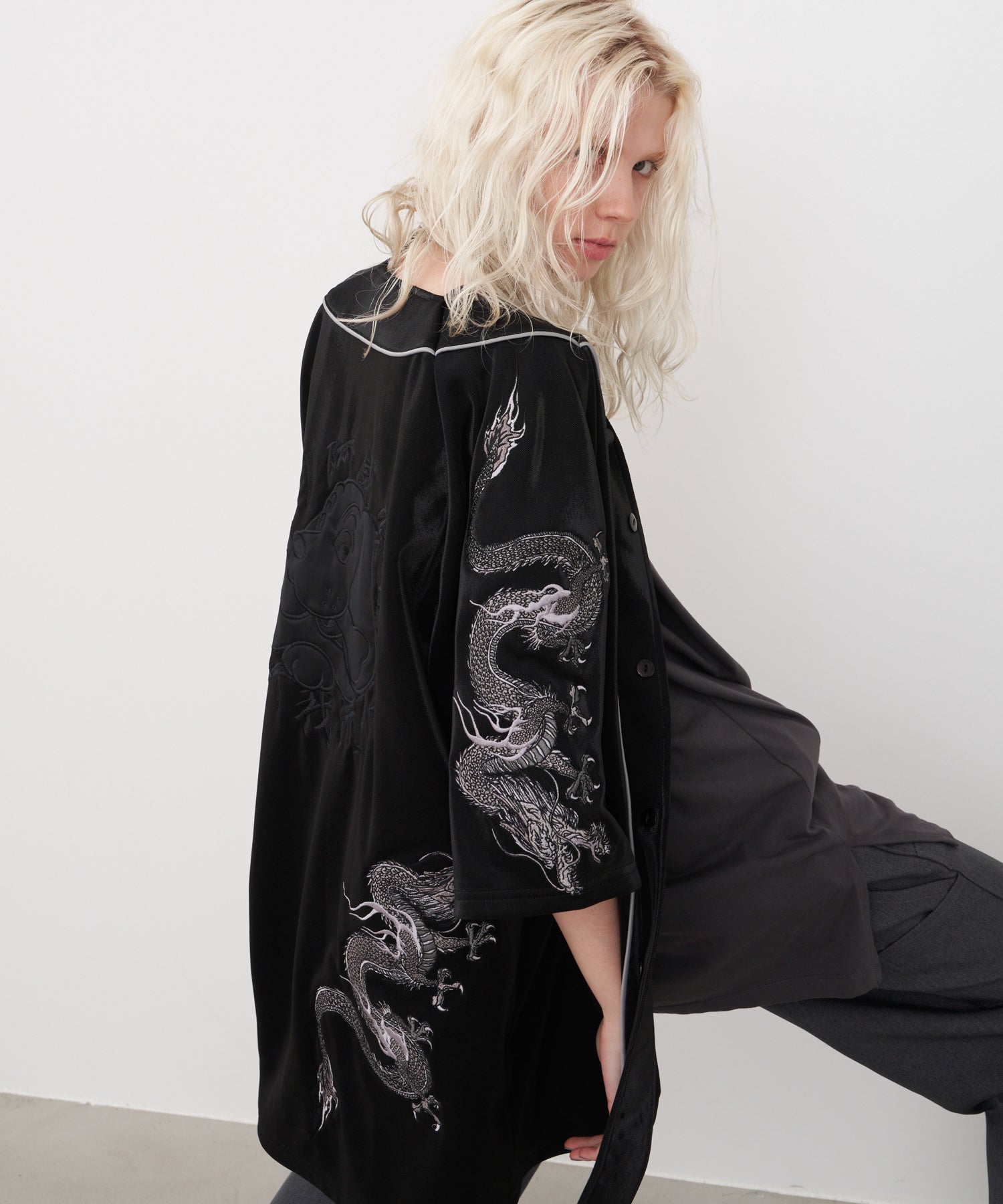 和柄の龍の刺繍を後ろと袖に大きくデザインしたGALFY×AIVERコラボのYABAIベースボールシャツ。