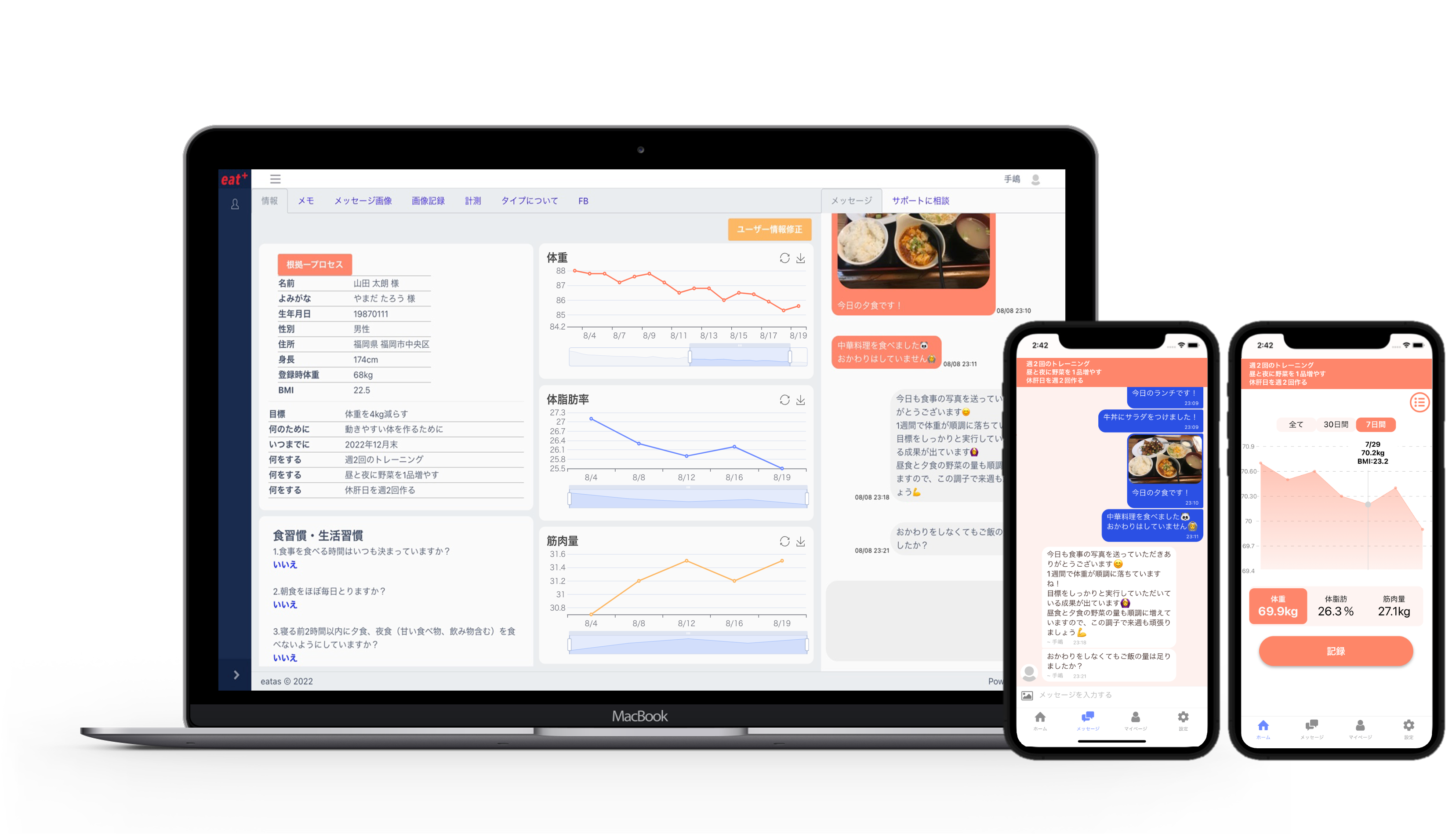 イータスが独自に開発した栄養管理メソッドをコミュニケーションツール化することで、可視化されたデータを共有しながら、オンラインでも成果が上がる食事指導ができるようになります。