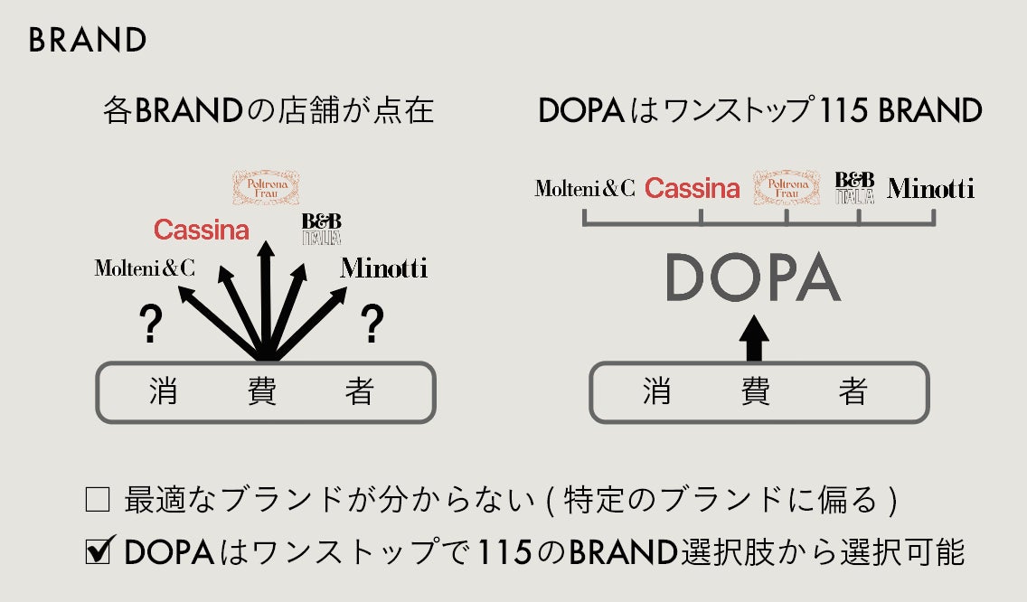 DOPAは世界を代表するあらゆる有名ブランドを網羅した115社のラインアップをご用意。ワンストップでお気に入りをお選びいただけます。