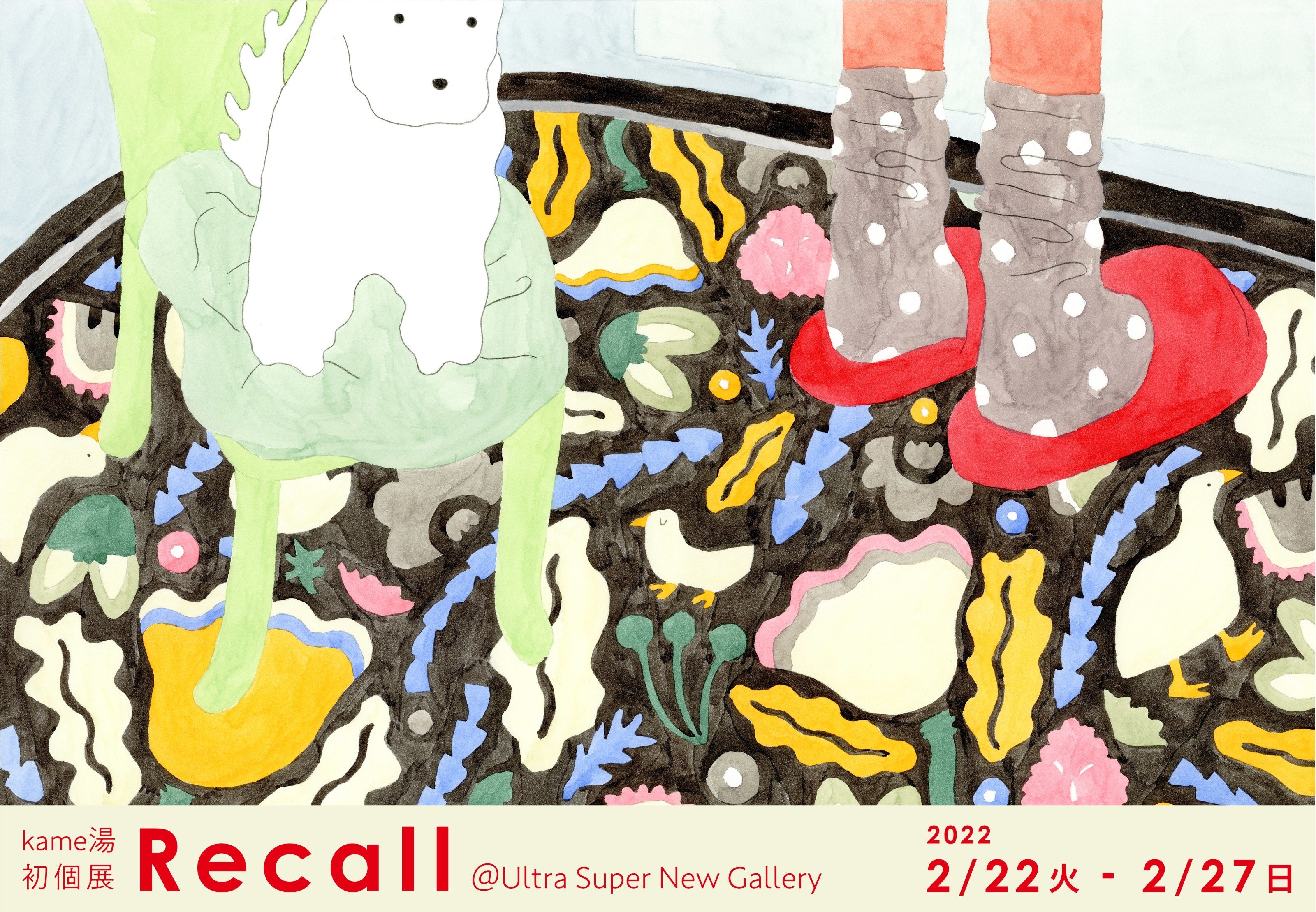 2022年2月22日(火)〜2022年2月27日(日)の期間、原宿UltraSuperNew Galleryではkame湯の初個展「Recall」を開催いたします。Twitterなどで注目を集めているイラスト作家「kame湯」は水彩を使用し、犬・花・チャーミングな風景をやさしく描くことが特徴となります。本展では忘却されたものや拾い上げられたものを柔らかく描いた水彩画が展示されます。お近くにお越しの際は是非お立ち寄りください!