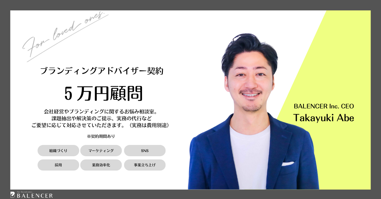 ブランディングアドバイザー契約 5万円顧問サービススタート!組織作りやマーケティング、SNSなどさまざまなお悩みに寄り添い、解決いたします。