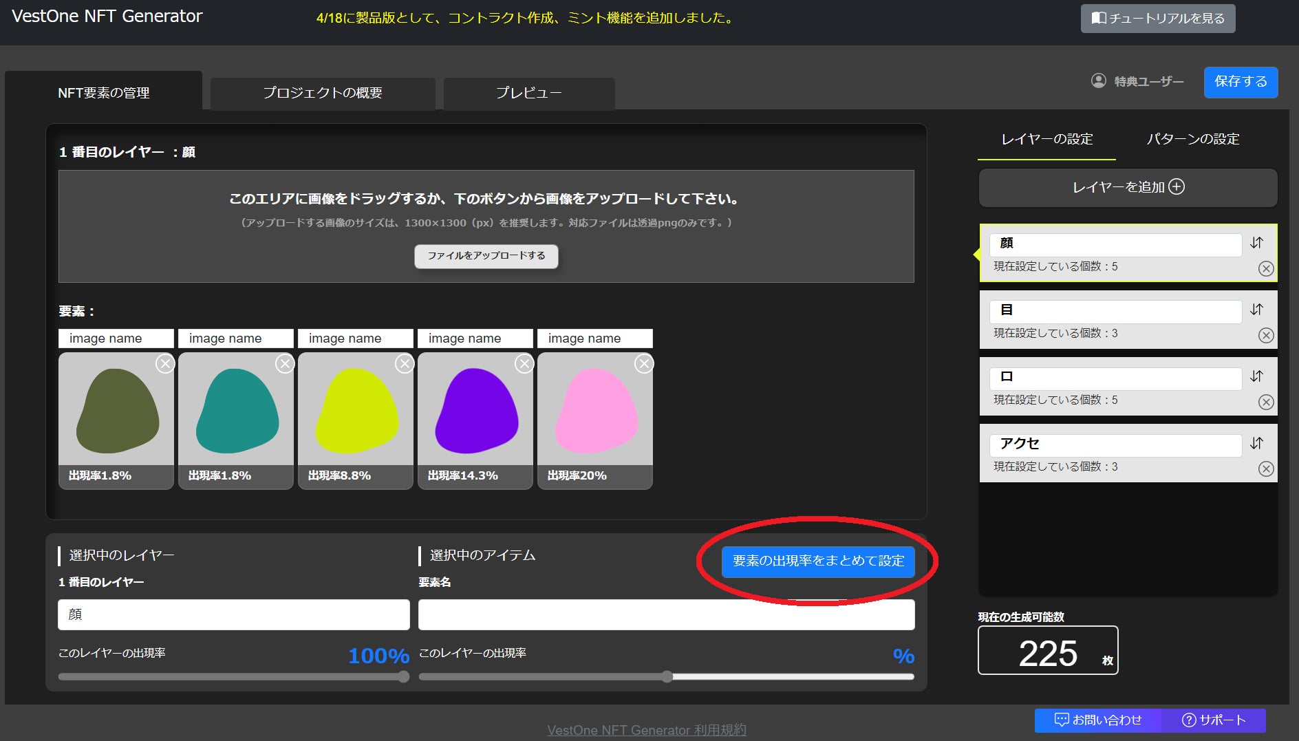 「NFT要素の管理」タブの画面上「要素の出現率をまとめて設定」から登録した要素(各パーツ画像)の出現率を設定することが可能になりました。