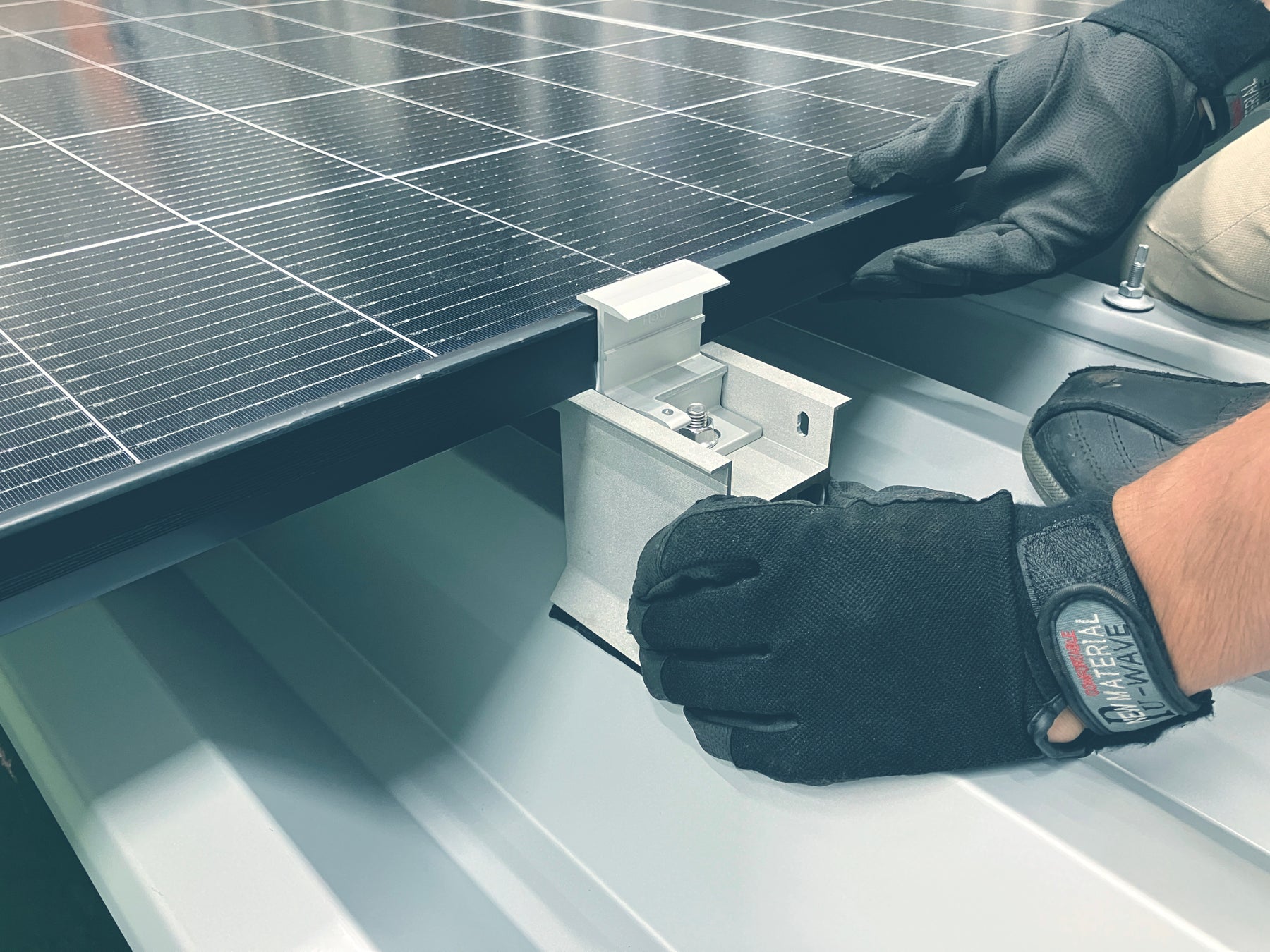 重ね式折板への設置の際に剣先ボルトを気にせず施工、金具とパネルの同時施工で施工時の大幅削減を実現