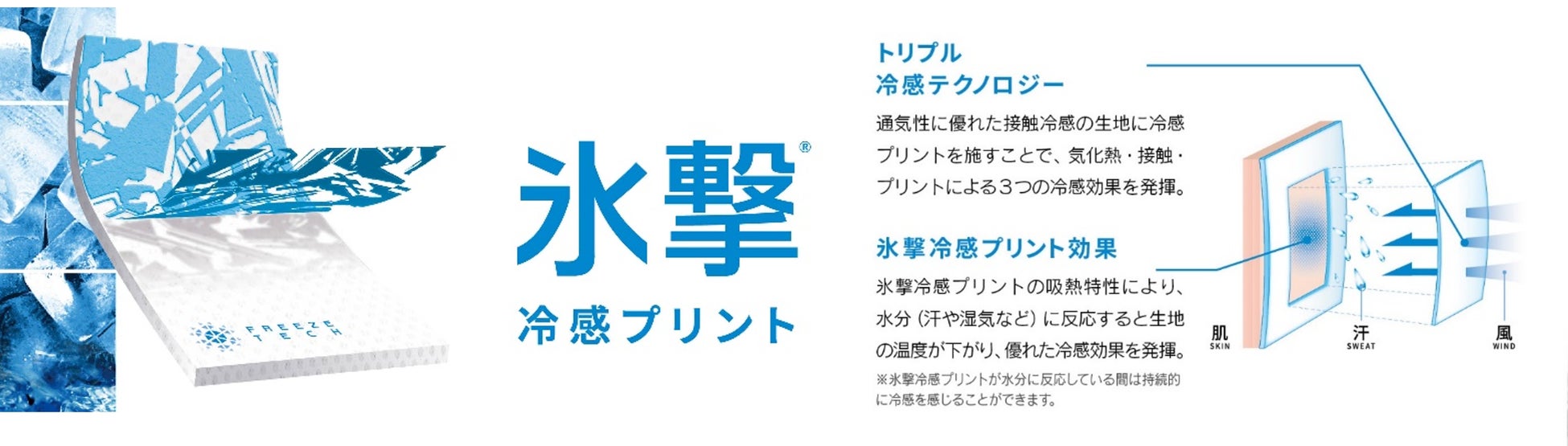 フリーズテックは、接触冷感生地に加え、裏地全面にエリスリトール、キシリトールを含有した特殊な《氷撃冷感プリント》を施しています。この《氷撃冷感プリント》で処理した生地が、人の皮膚から発生する水分(汗)を吸収すると、その吸熱特性により生地温度が下がり、冷感を付与します。 また、風をうけることにより冷感をさらに強く感じることができます。触った時の冷感だけでなく、汗をかくことで冷感が“持続”するため、真夏の作業やスポーツ等での暑さ対策としておすすめ。