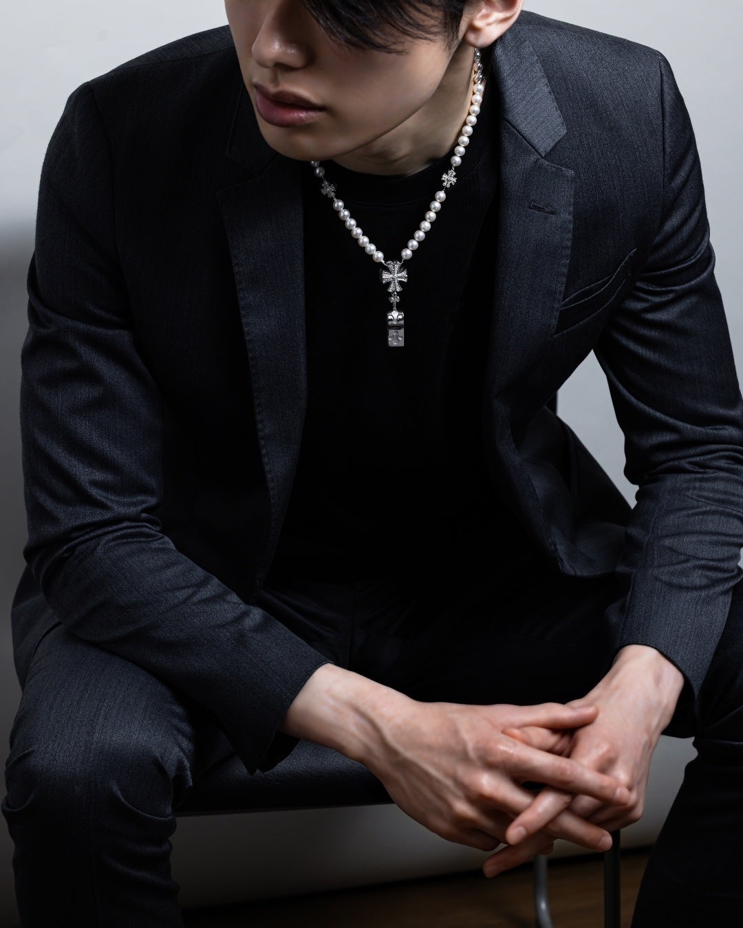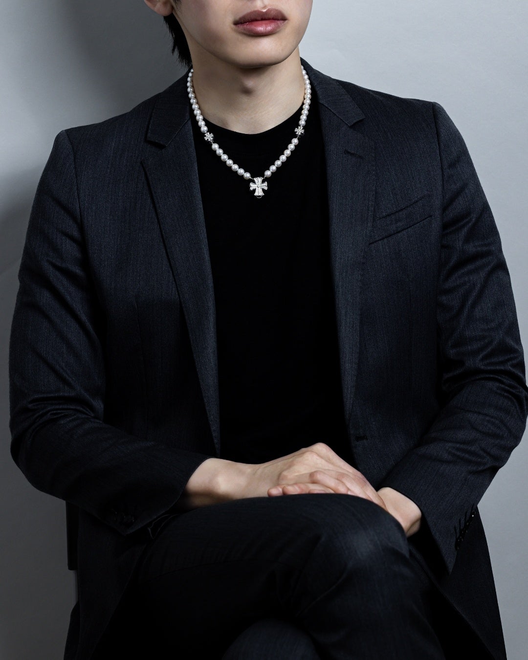 また、ネックレスの下部のリング部分にお好みのペンダントトップを自由に組み合わせて、自分だけのネックレスを楽しめる仕様となっています。日常使いから特別なシーンまで幅広く対応するデザイン性と、カスタマイズ可能な機能性を兼ね備えております。柔らかな光を放つパールと、無骨で精巧なK18ゴールドクロスが絶妙なバランスで調和し、ファッションの中で確かな存在感を放ちます。
