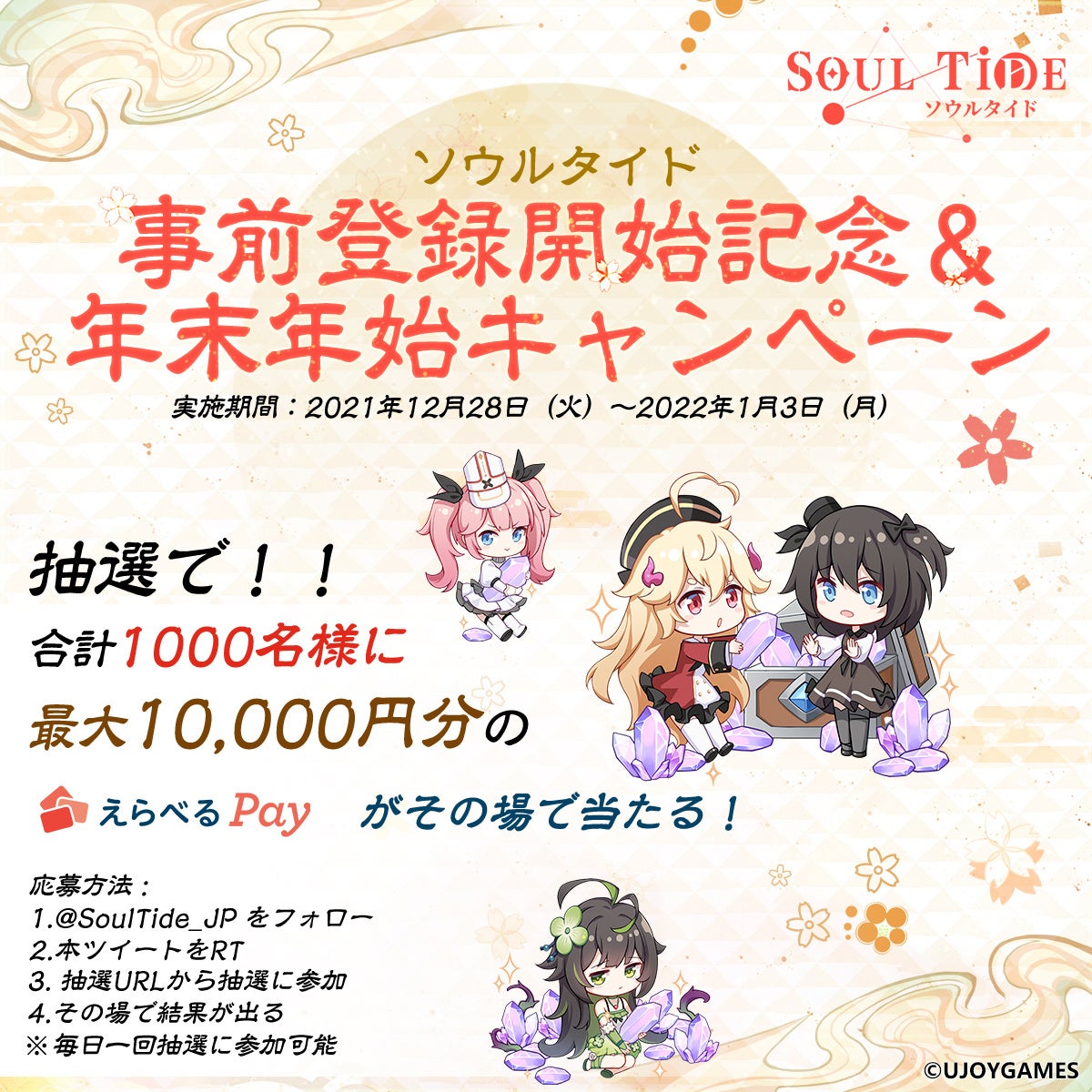 さらに、同日12月28日から、事前登録開始を記念した新年特大キャンペーンを実施しております。最大10,000円分の賞品が当たるチャンスを、ぜひお見逃しなく。「ソウルタイド」を、この機会にぜひチェックをお願いします!