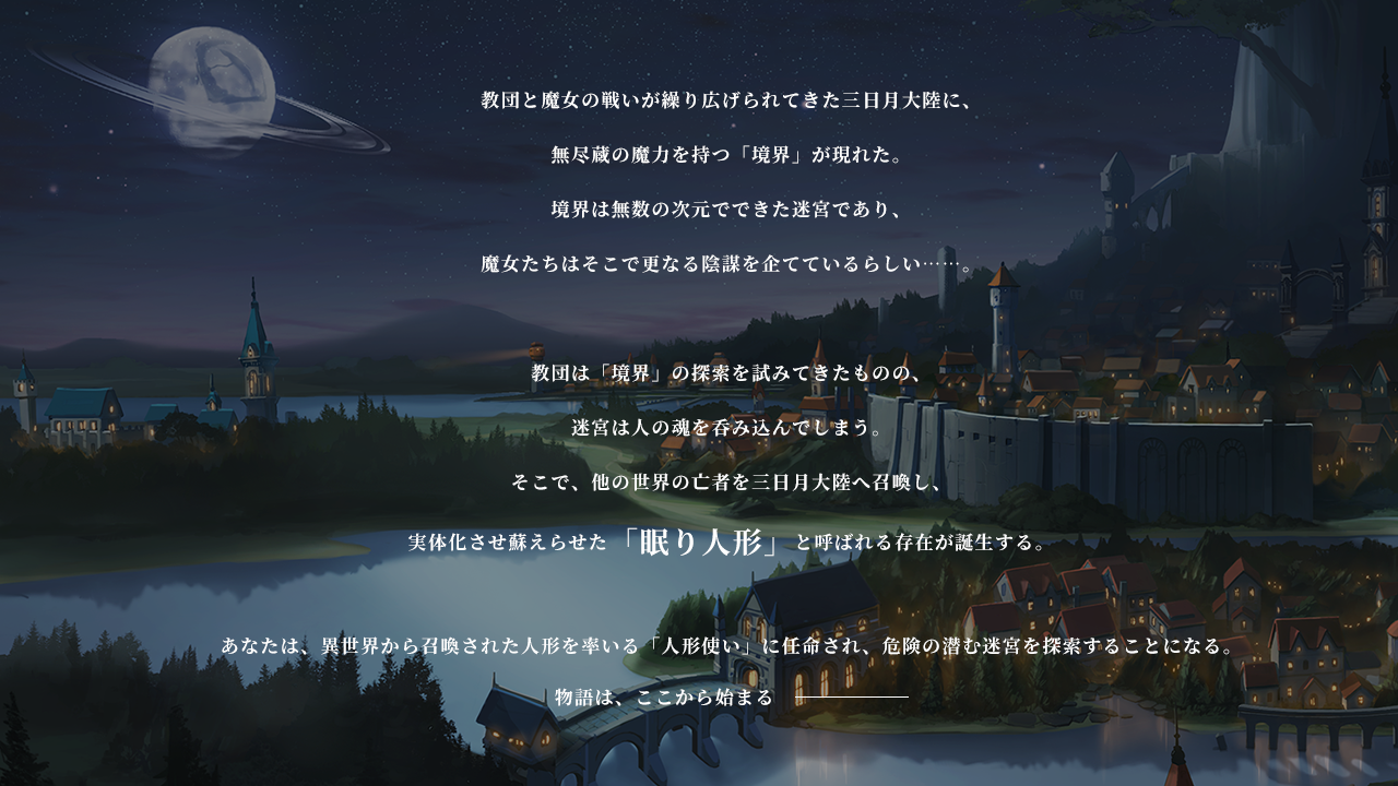 ソウルタイドの舞台となるのは、教団と魔女の戦いが繰り広げられてきた三日月大陸。そこに、無尽蔵の魔力を持つ「境界」が現れた。境界は無数の次元でできた迷宮であり、魔女たちはそこで更なる陰謀を企てているらしい……。教団は「境界」の探索を試みてきたものの、迷宮は人の魂を呑み込んでしまう。そこで、他の世界の亡者を三日月大陸へ召喚し、実体化させ蘇えらせた「眠り人形」と呼ばれる存在が誕生する。あなたは、異世界から召喚された人形を率いる「人形使い」に任命され、危険の潜む迷宮を探索することになる。魔女によって壊された故郷、人形たちとの絆。個性豊かな仲間たちと共に、いざ迷宮の最奥へ。