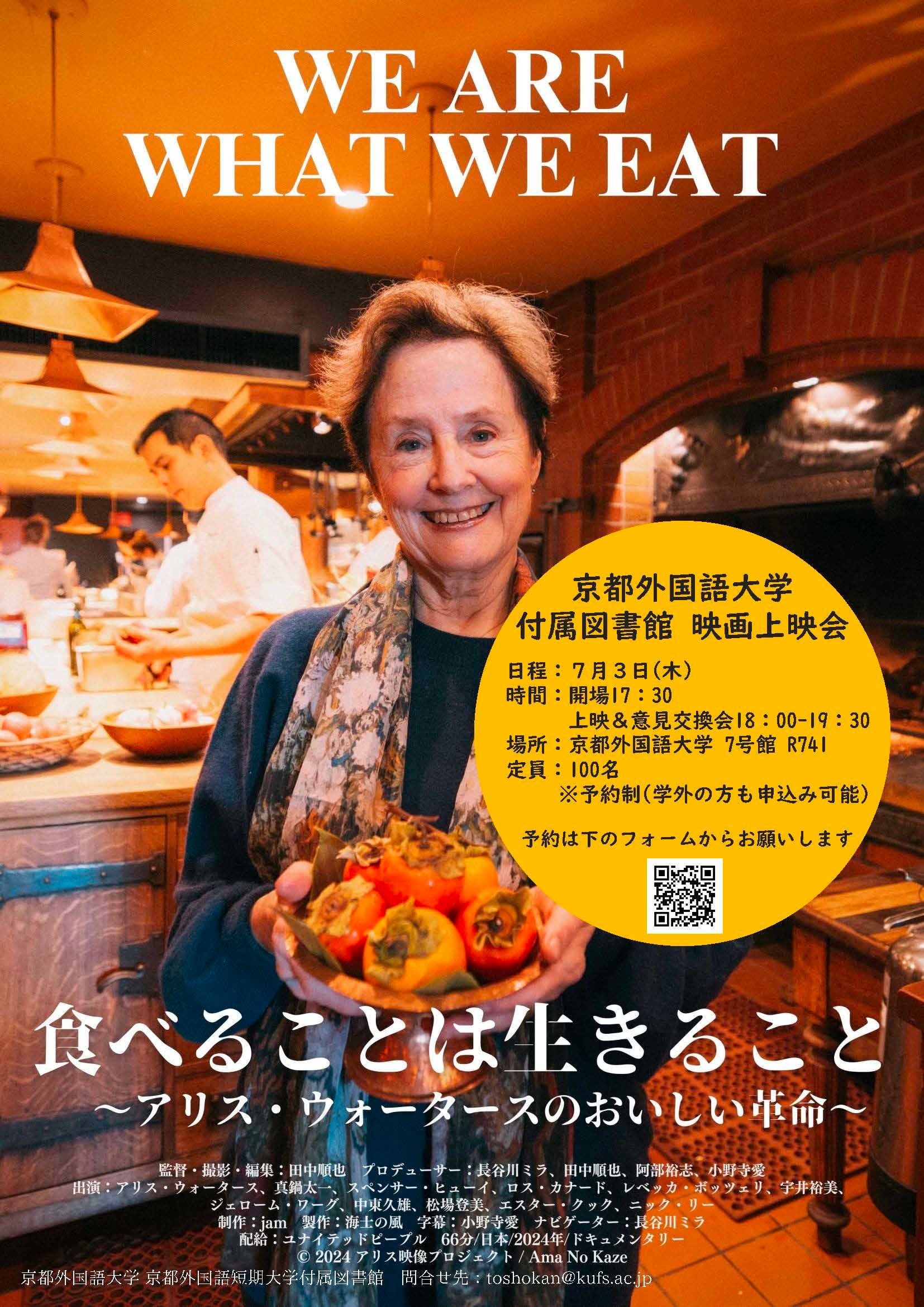 京都外国語⼤学(京都市右京区 学⻑:⼩野隆啓 以下 本学)は、2025年7月3日(木)、京都外国語大学7号館4階R741にて、映画上映会「食べることは生きること〜アリス・ウォータースのおいしい革命〜」を開催します。『GAIDAI BIBLIOTHECA No.242』の特集で取り上げた「SDGsから考える「食」―つくる責任、つかう責任―」に関連する映画となっています。カリフォルニアのバークレーを拠点に、半世紀かけてアメリカの食文化を変えたアリス・ウォータースのドキュメンタリー映画です。