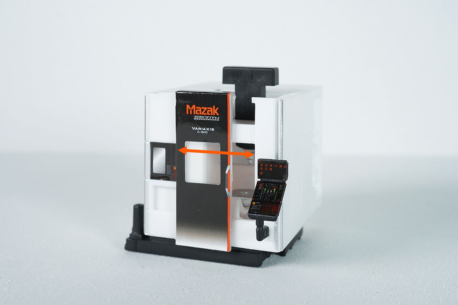 当社を代表する製品5機種を1/64スケールで細部まで再現したカプセルトイで、全機種前面扉の開閉が可能です。機内の主軸・テーブルなど細かな造形も実機同様に精巧に再現し、板金の質感、ドアやNC操作盤などに貼るシールの色合いも忠実に再現しました。