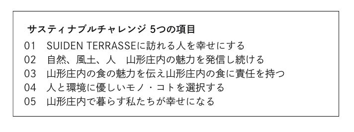 地球環境の破壊や紛争問題、原料やエネルギーコスト高騰など世界規模で課題が山積する中、2024年度も〈サスティナブルチャレンジ〉への取り組みを継続しています。下記の5項目を行動指針としホテルの重要なサービスである食や滞在を通して社会課題に取り組むだけではなく、お客様が庄内の人と関わり土地の魅力に触れる機会の造成、そして私たちスタッフの幸せの追求など、多角的な視点で取り組んでまいります。