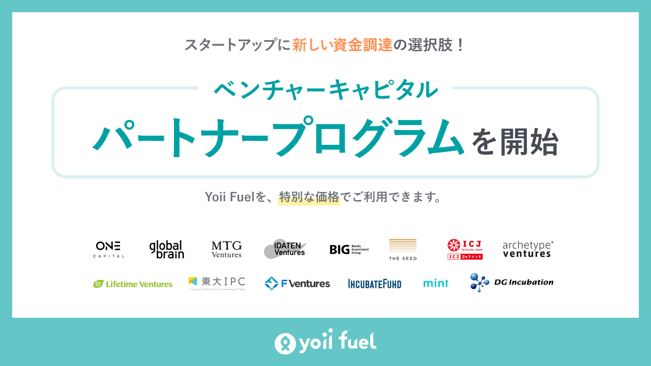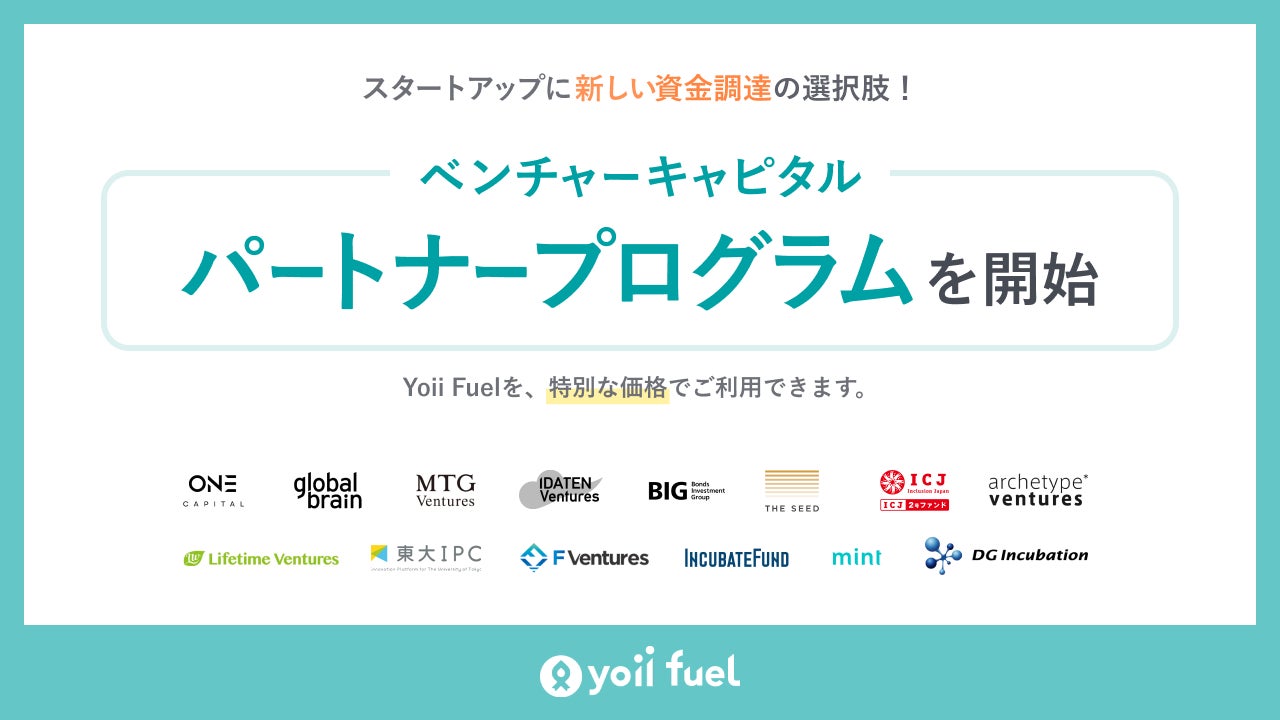 レベニュー・ベースド・ファイナンスプラットフォーム「Yoii Fuel(ヨイフューエル)」を運営する株式会社Yoii(ヨイ、本社:東京都渋谷区、代表取締役CEO:宇野雅晴、ウェブサイト:https://yoii.jp/)は、ベンチャーキャピタルと連携したパートナープログラムを開始しました。パートナーとなるベンチャーキャピタルの出資先企業は、Yoii Fuelを特別価格にて利用できます。
