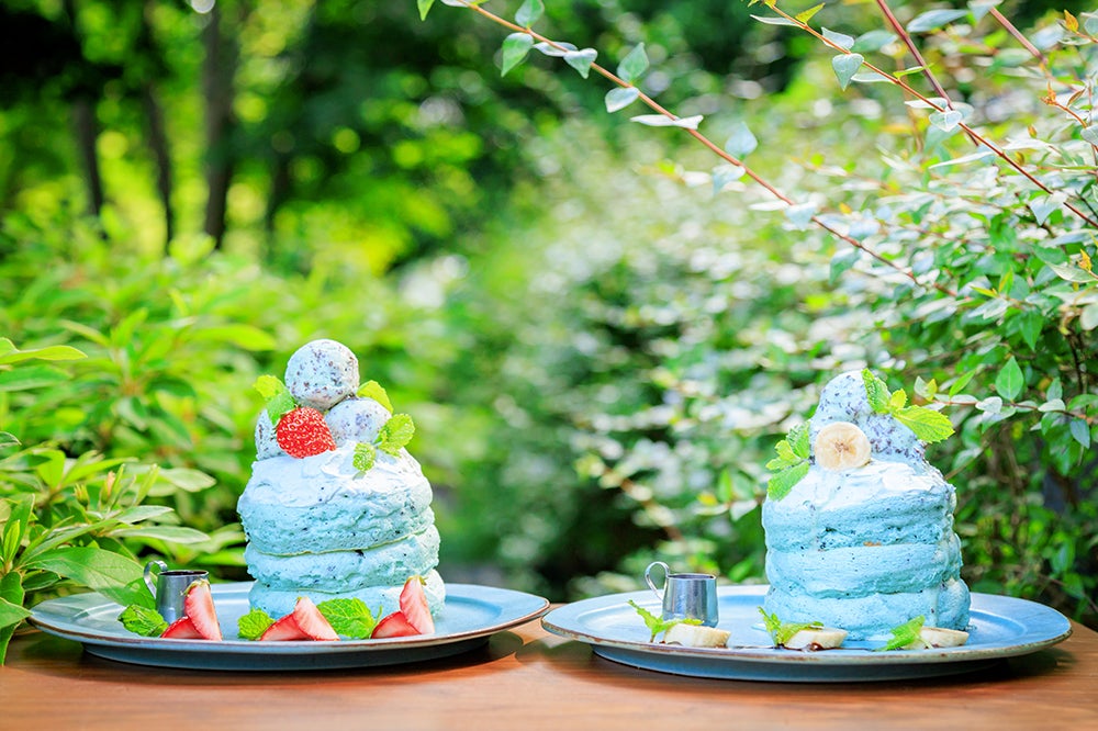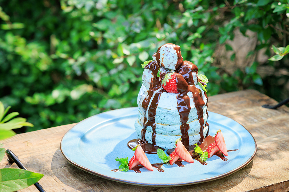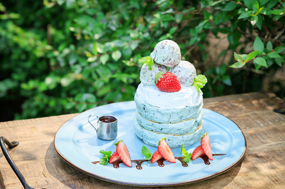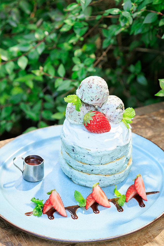 東京六本木店は、自家製アールグレイチョコレートと苺をアクセントに入れた「チョコミントパンケーキEAST」。