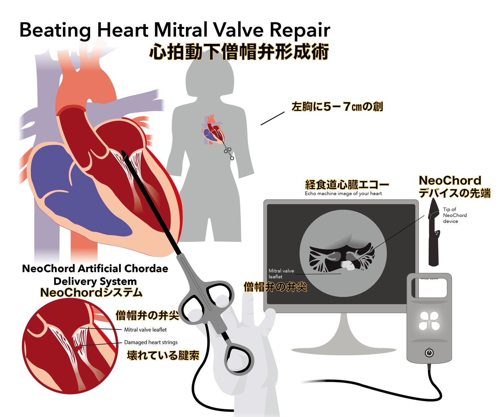 - 心臓が拍動している状態で治療効果の判定が可能・・・心拍動下でリアルタイムに僧帽弁の逆流が制御されることを確認できることも大きなメリットです。従来の心停止下の手術では弁の形成をした後、心臓が動いた状態になるまで弁の逆流が制御されたことの最終的な確認が出来ませんでした。NeoChord®を使用した手術方法では経食道心エコーで弁の状態を観察しながら人工腱索の長さを調整することが出来ます。
