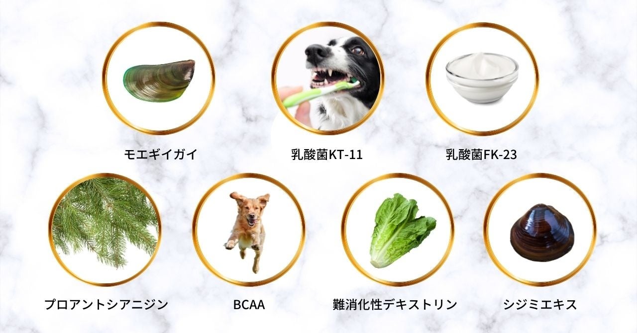 7種類のサプリメント (モエギイガイ・乳酸菌KT-11・乳酸菌FK-23・プロアントシアニジン・BCAA・難消化性デキストリン・シジミエキス) は、その1つずつを獣医師とペット栄養管理士が獣医学及びペット栄養学に基づき試行錯誤を繰り返して約1年かけて開発しました。