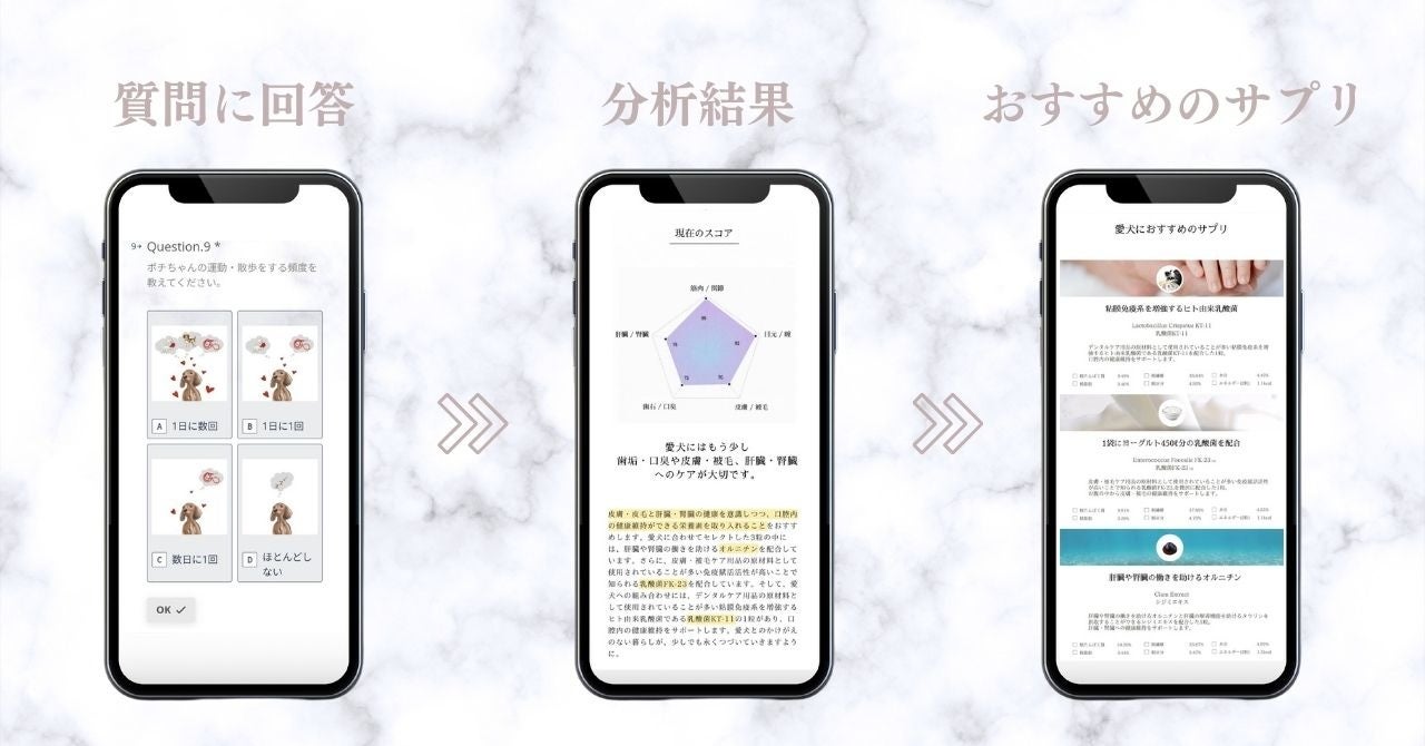 この度、よりパーソナライズ性を高めたサプリメントを提供するために、①豊富な回答パターン②分析結果の可視化③おすすめする理由の明確化 の3点を踏まえて、新たに『愛犬の体調分析』として分析システムをリリース致しました。