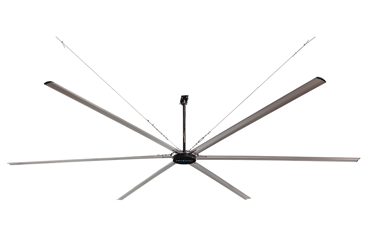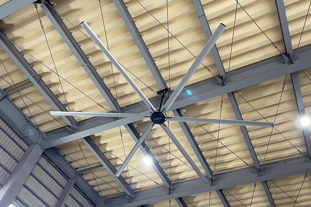 大型シーリングファン「スマイルファン」は、倉庫や工場などの広い施設で空気を撹拌することにより、エアコンの冷暖房効果を効率的に高めることができます。本製品の導入により、冷暖房の設定温度を適切に保つことができ、快適性を高めた上で、消費電力を大幅に削減することができます。