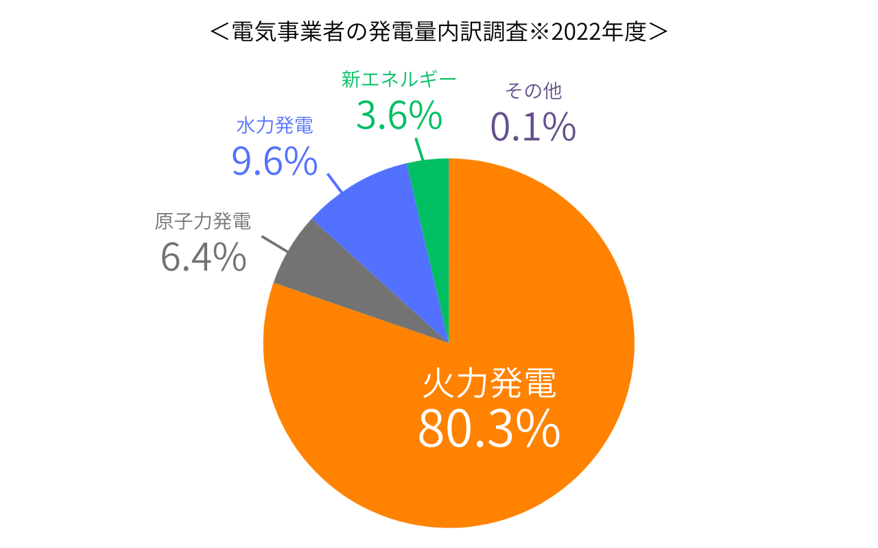 大気中のCO2濃度の増加は、石油や石炭など化石燃料の使用が増えたことが主な原因です。エアコンの使用に伴う電力は、発電所での化石燃料の燃焼によって生産されており、水力や風力など複数の発電方法が存在する中、日本では火力発電が80.3%を占めています。