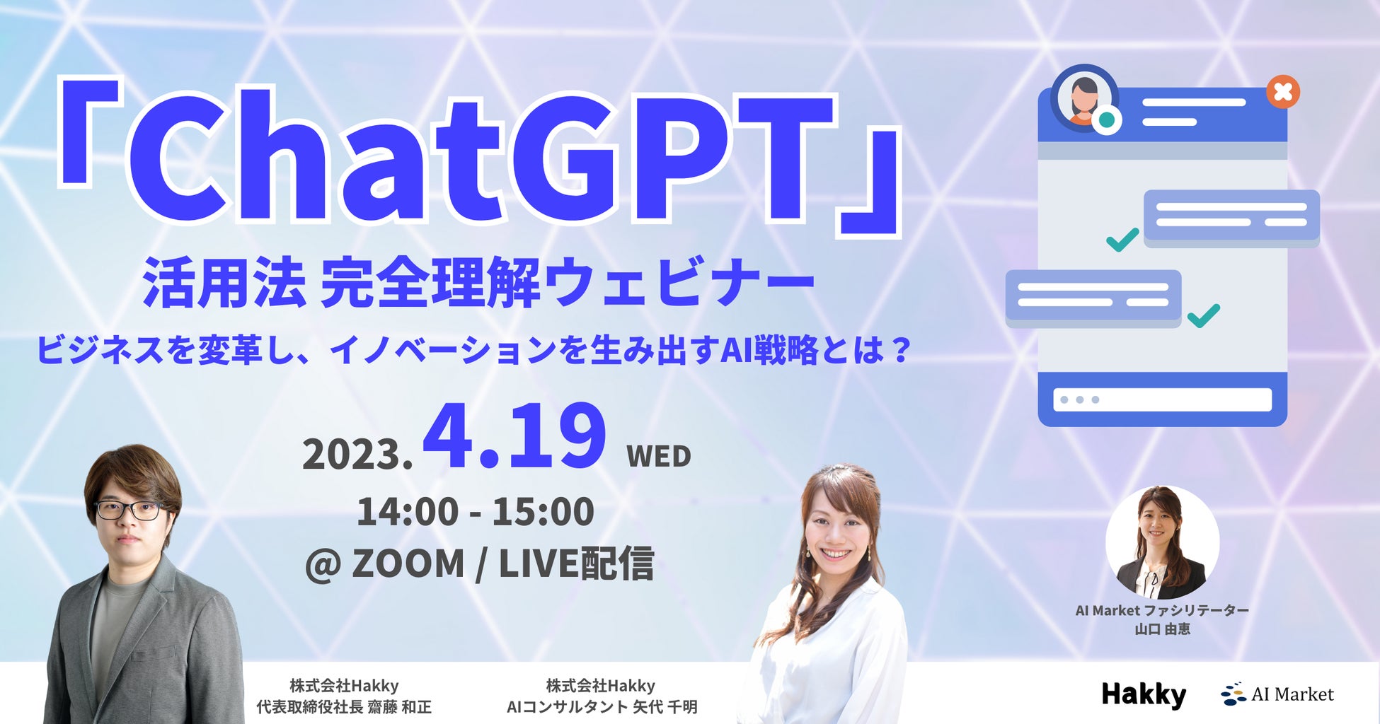 【AI Market】「ChatGPT」活用法 完全理解!!ビジネスを変革し、イノベーションを生み出すAI戦略とは?ウェビナーを4月19日(水)に開催!