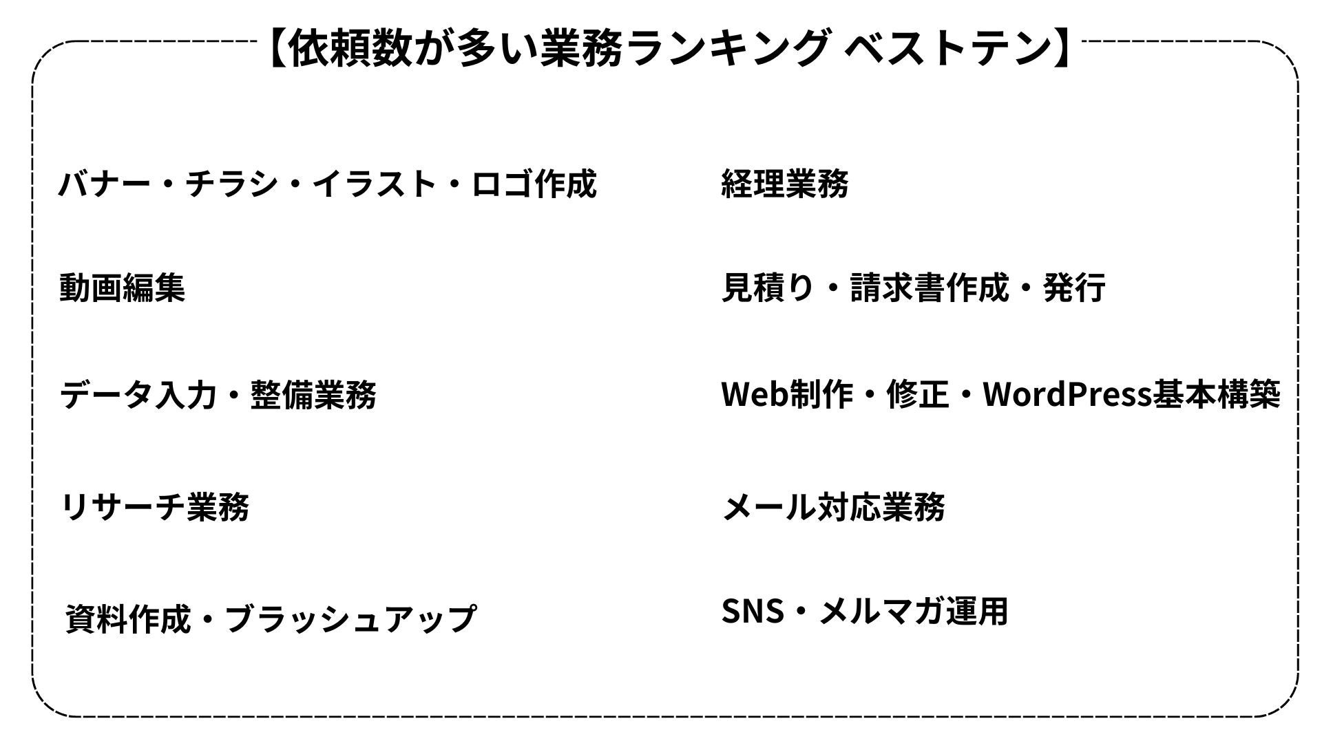 中小企業は「この業務を任せたい」など業務が切り分けられている訳ではなく、「色々やらないといけないことがあるけど、人手が足りなくてやれない」というお悩みを抱えています。複数の業務を同時に対応できるサポートが求められていることが分かります。