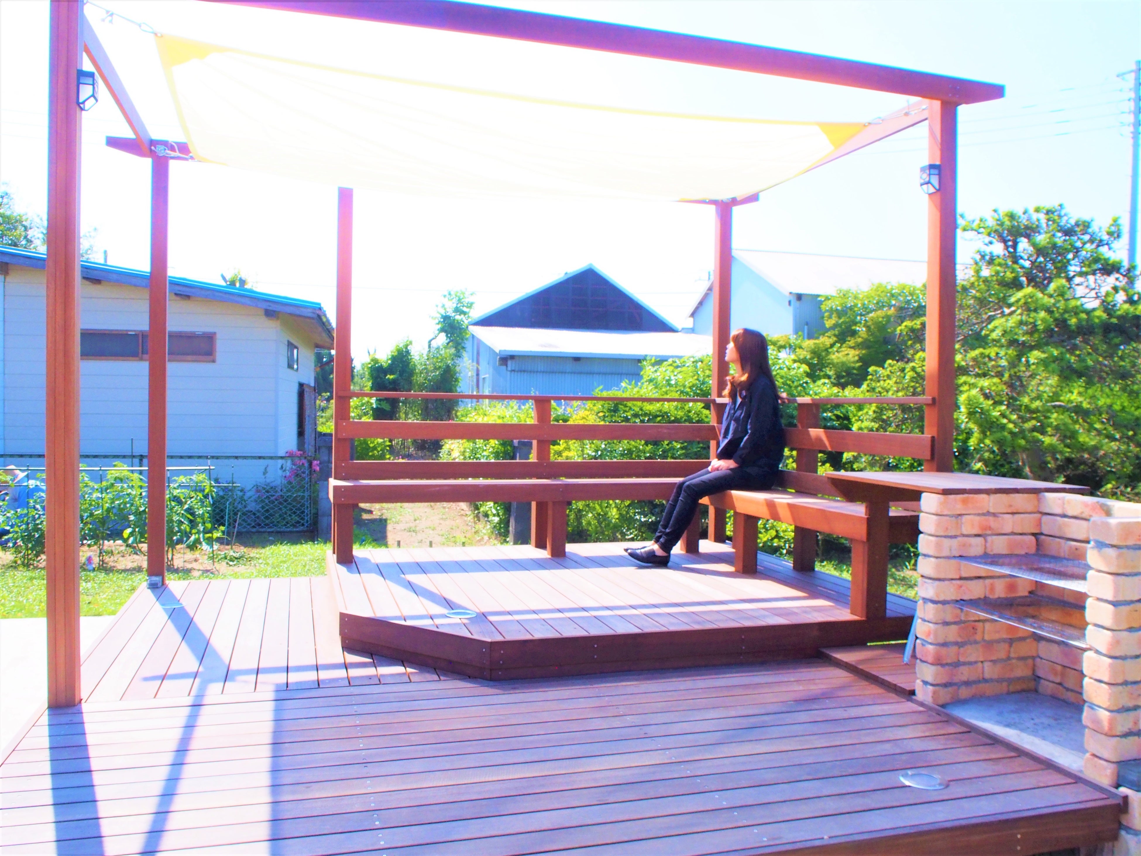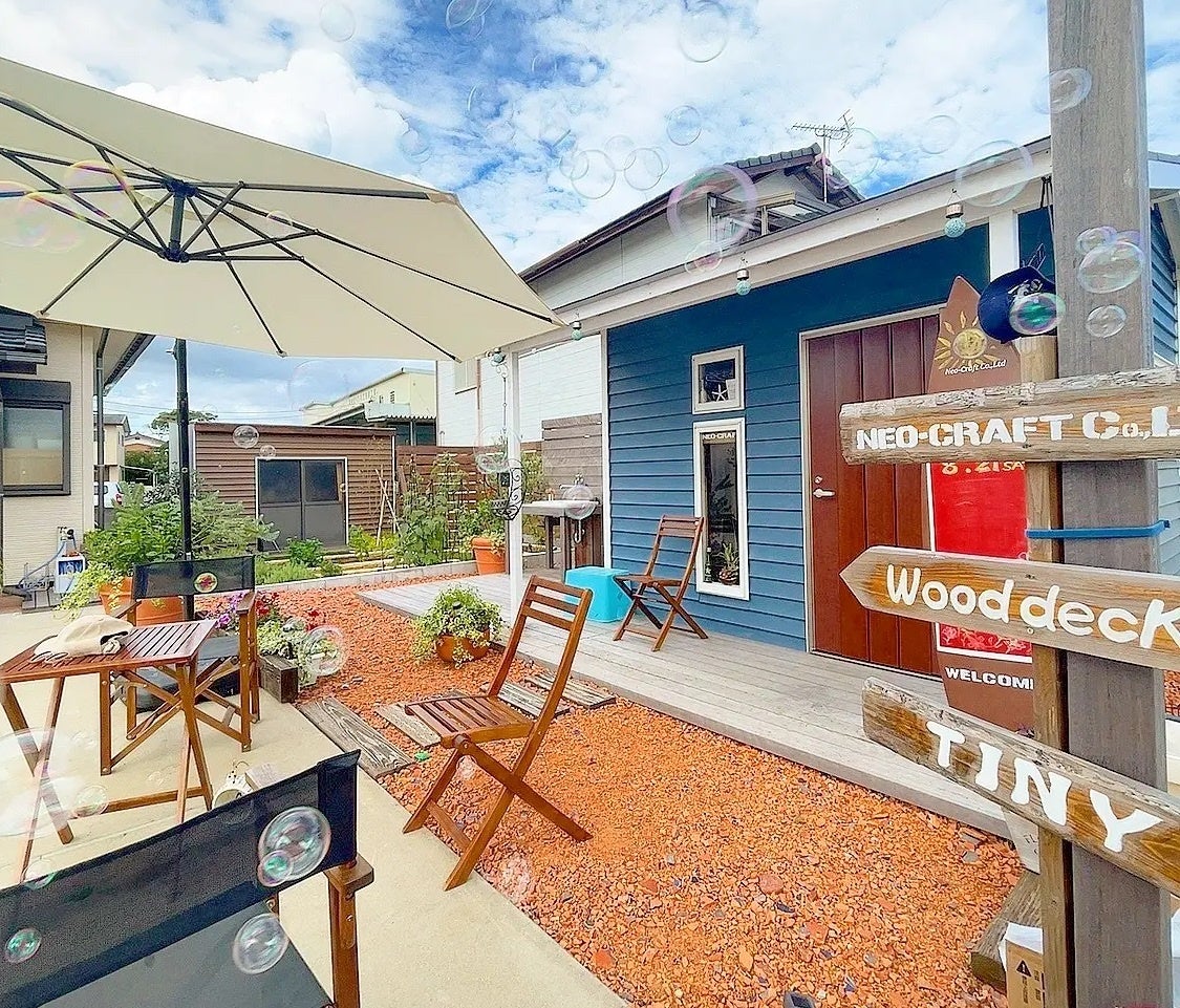 広々とした敷地に佇む平屋、その空間にバーベキュー可能なウッドデッキと小屋キットTINYを展示するエクステリア展示場。海まで徒歩5分、周囲の視線も気にならないプライベート感たっぷりの空間です。