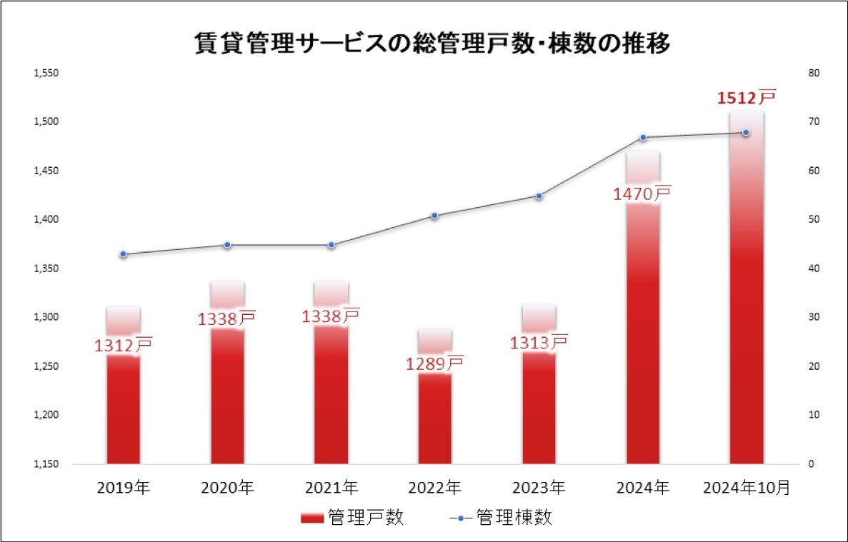 自社の賃貸物件の管理業務で培ったノウハウを一般のオーナーにも間口を広げることで、一人でも多くのオーナーや入居者に喜んでもらいたいという一心で事業を拡大し、2024年10月1日時点で総管理戸数1,512戸、総管理棟数68棟と、管理棟数・戸数共に右肩上がりで増加しています。