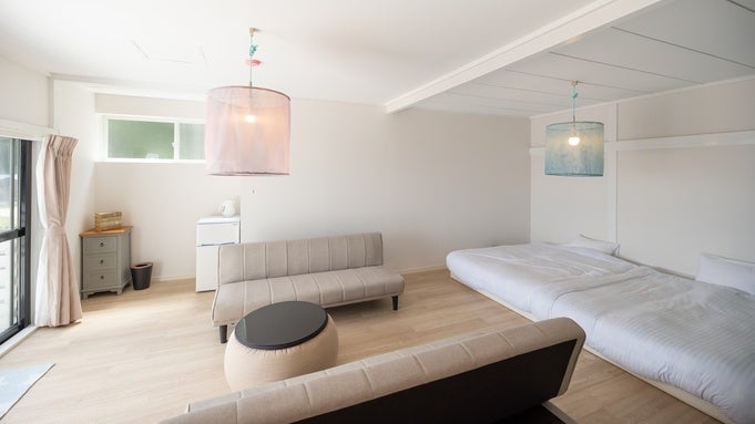 3棟のコテージにはシャワー、お風呂があり、4~6名様まで泊まれることができます。デッキにはテーブル、チェア、そして洗濯機まで完備されています。ベッド、ソファーベッド、布団でゆったりと6名様がくつろげます。