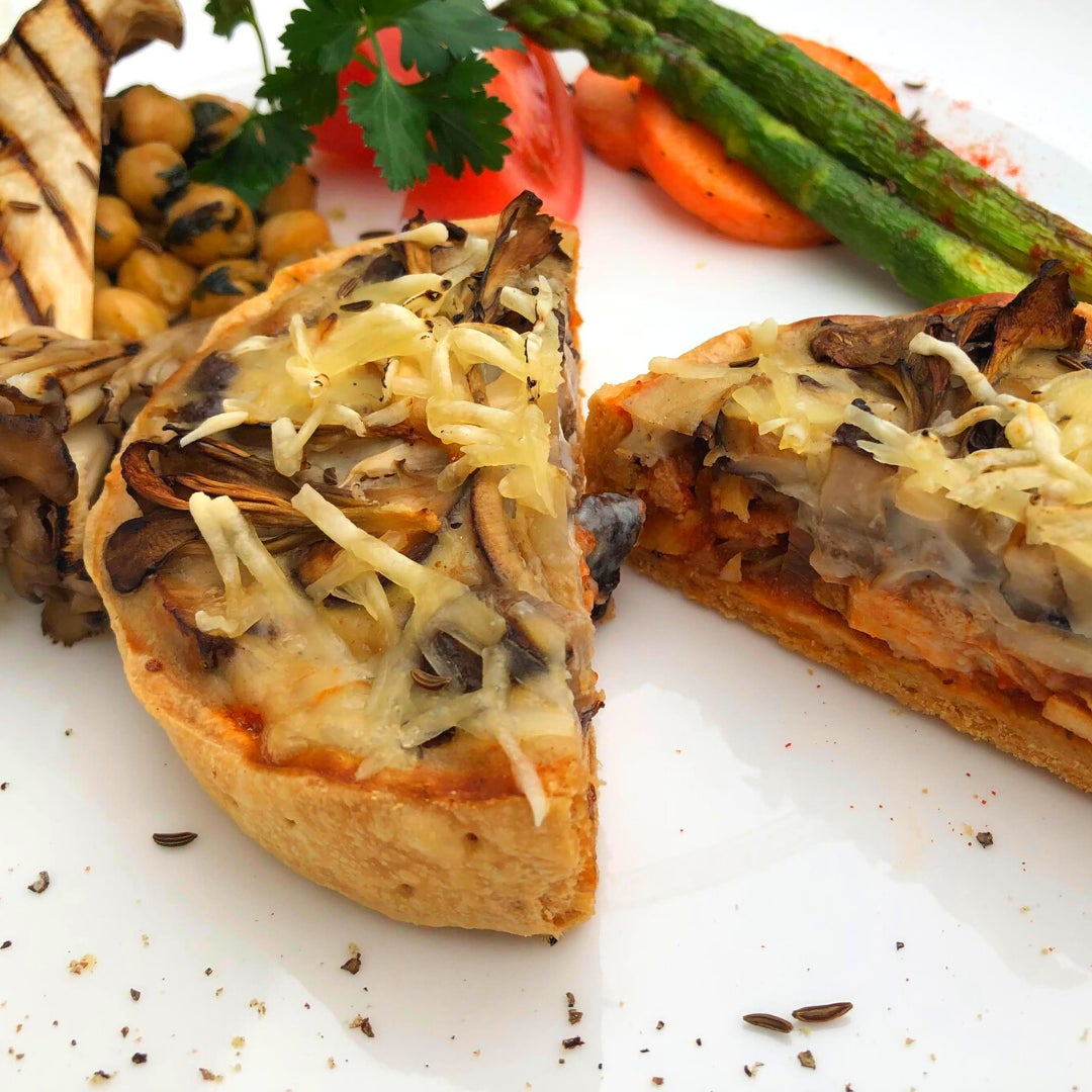食感と旨味成分の多いキノコ類と豆腐と豆乳をベースとした塩麹を隠し味に使ったアパレイユ。チーズは牛乳由来ではなく、ココナッツオイルを使用して作られたものを。キッシュ生地も一切、乳製品や卵を使う事なく植物性100%で再現致しました。