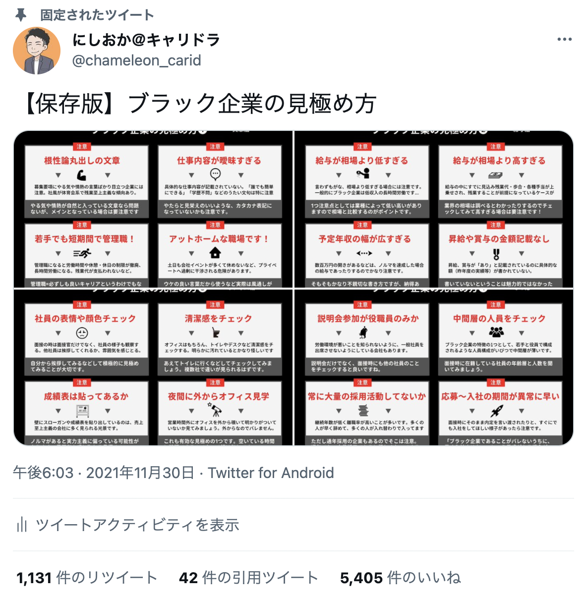 株式会社カメレオン(本社:東京都千代田区)の代表 西岡浩起は、11月よりTwitterで転職に関する情報を発信しています。その中で、12月の職場のハラスメント防止月間に合わせて投稿した「ブラック企業の見極め方」がじわじわと反響を呼んでいます。