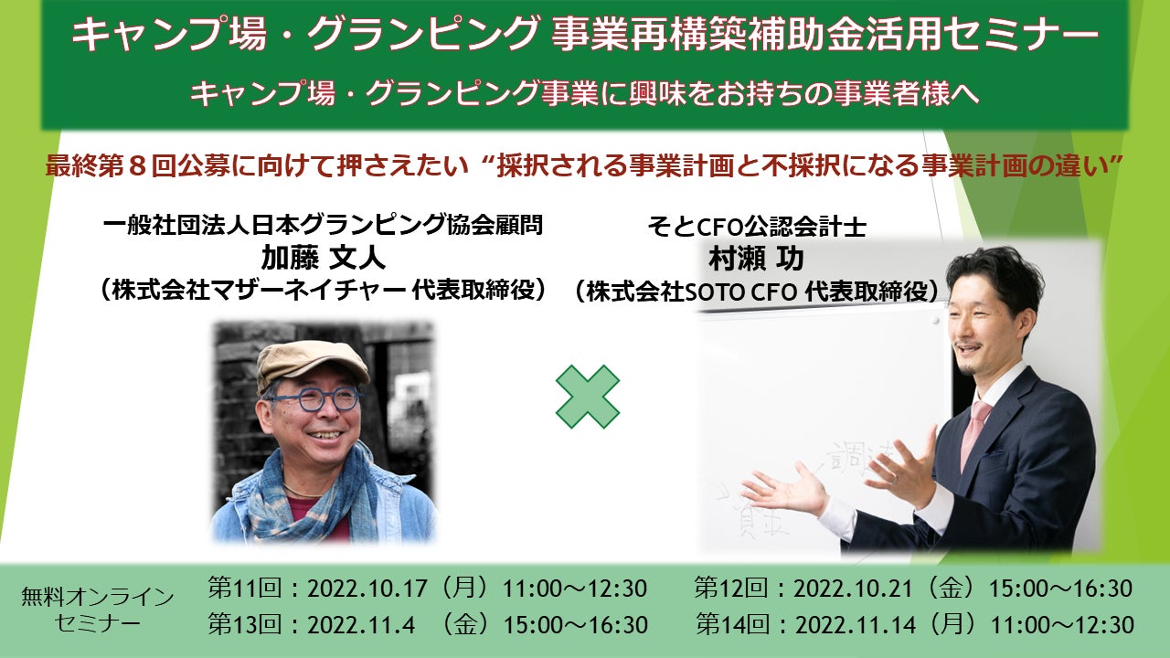 “キャンプ場運営会社等アウトドアビジネスベンチャー企業CFOとして事業再構築補助金申請、及び支援コンサルティングにより、採択事例を有するからこそお伝えできる、事業再構築補助金制度が求める指針に基づいた事業計画書作成のポイント”