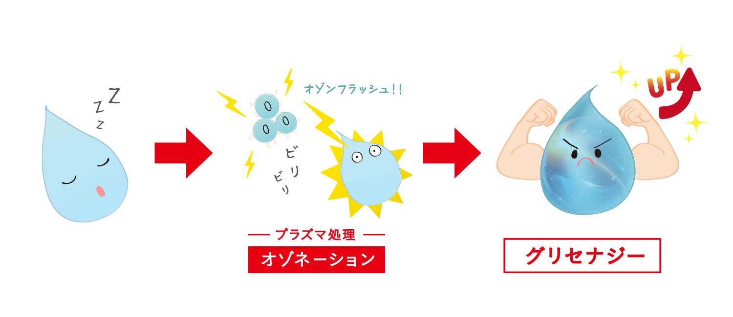 着目したのは、保湿成分として多くの化粧品に配合されてきた“グリセリン”。この安全性の高いグリセリンを特許製法「オゾネーション」により、高機能成分へとパワーアップすることに成功し、生まれたのが独自成分「グリセナジーMK(表示成分名:オゾン化グリセリン)」です。 酸化を味方につけた2つの作用が、安全に肌の濁りを分解します。