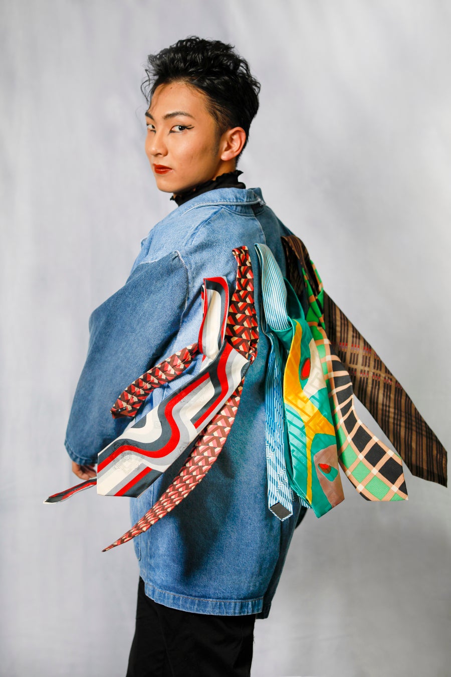 今回モデルが着用した衣装は総合プロデューサーであるマンジョットからのコンセプトを受け、コスチュームデザインチームの「Jas&Michiko」が担当。ジャージとスーツなど役割の異なる服を組み合わせてリメイク、すべてハンドメイドで用意されました。介護職と高齢者の衣装は、それぞれから切り離したパーツが随所に仕付けられた他、着るペアの関係性を演出する様々な遊び心がデザインの中に盛り込まれています。サーキュラーエコノミックアプローチも軸に置きつつ、過去のデザインと現在のアイデアを融合することで、「世代をリンクさせ、それを着る二人をもリンクさせるファッション」を実現しました。