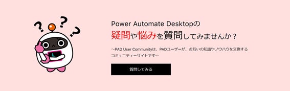 ユーザーフォーラム(URL: https://pad-user-community.com/)は、 ユーザー同士で質問し回答を得たり、PADに関する情報や話題を 交換したりすることで、お互いの知識やノウハウを共有することを 目的としたコミュニケーションサイトです。 過去に投稿された質問や回答を参照することで、 自分自身で疑問を解決しながら、PADの活用を深めることができます。
